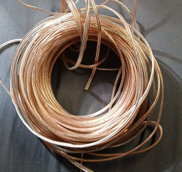 This is a spool of bulk speaker wire. It's clear with copper and silver strands. This wire is great for setting up home audio systems or for various DIY electronics projects.