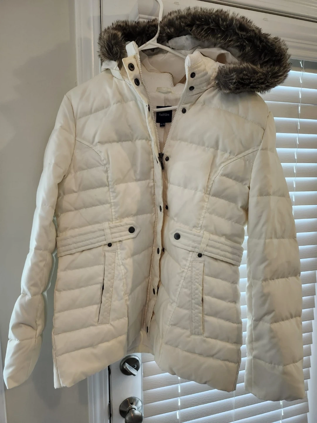 A stylish and cozy Kellmans puffer jacket in size XL! This jacket is perfect for staying warm during the colder months. It features a beautiful white colour and a comfortable fit!