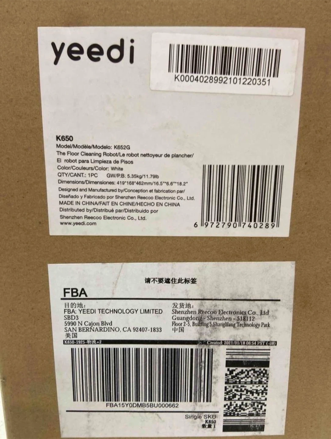 Selling a Yeedi K650 floor cleaning robot! This robot is designed to keep your floors spotless with ease. It's white and comes with all original components. The dimensions are 419*168*462mm / 16.5"*6.6"*18.2". It's designed and manufactured by Shenzhen Reecoo Electronic Co. The robot weighs 5.35kg/11.79lb. Get yours today!