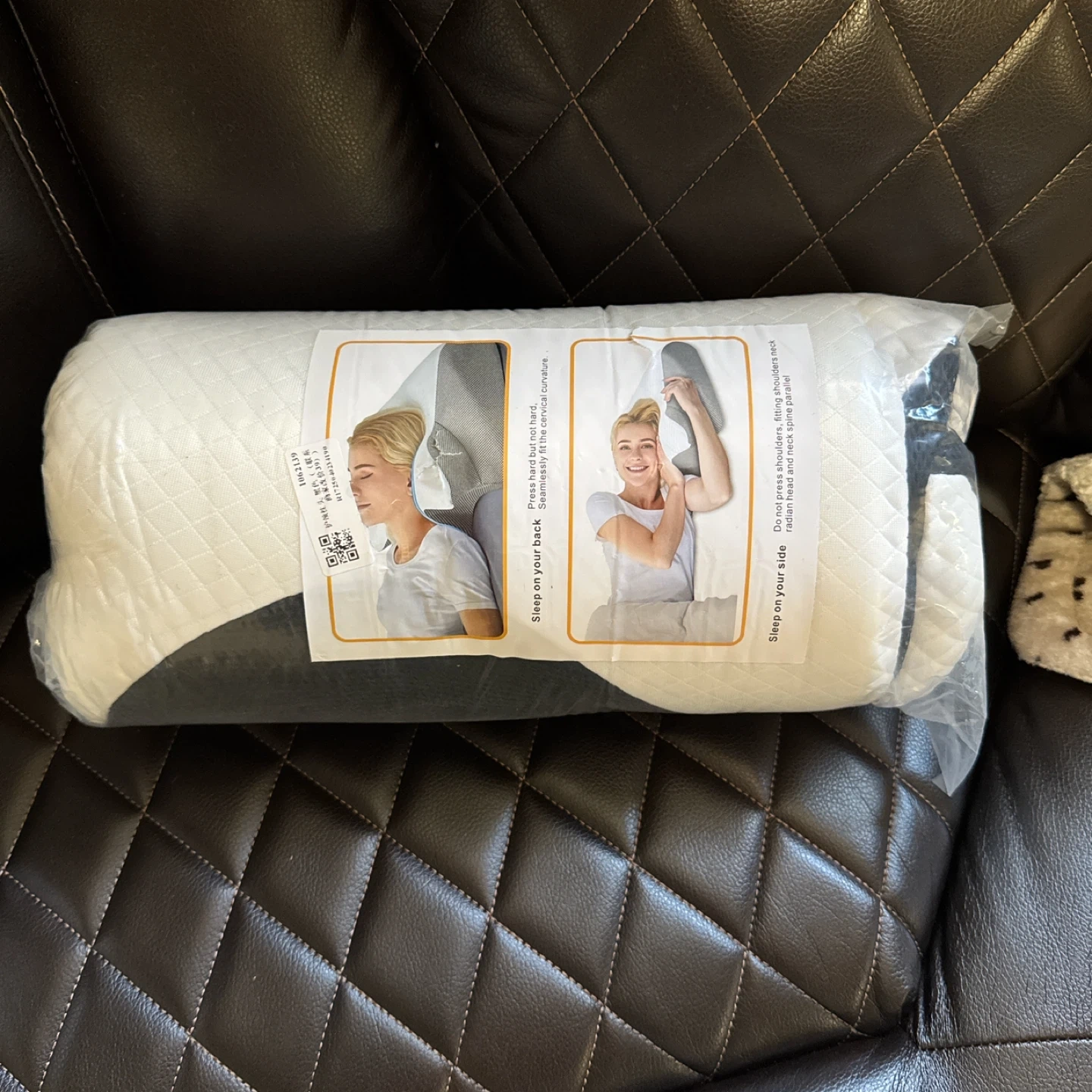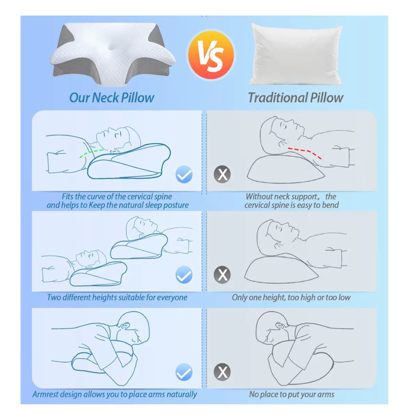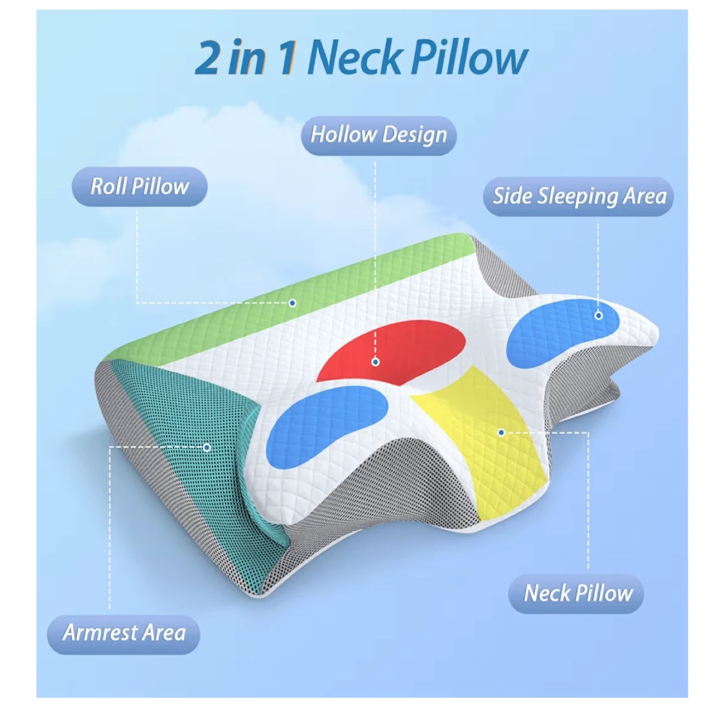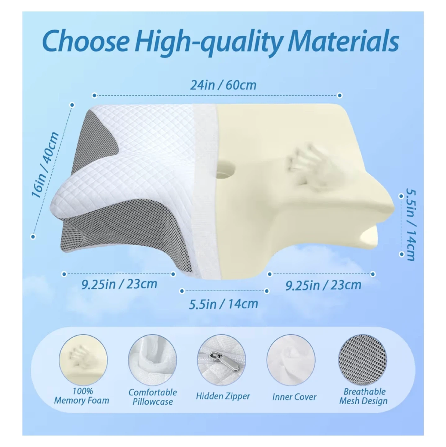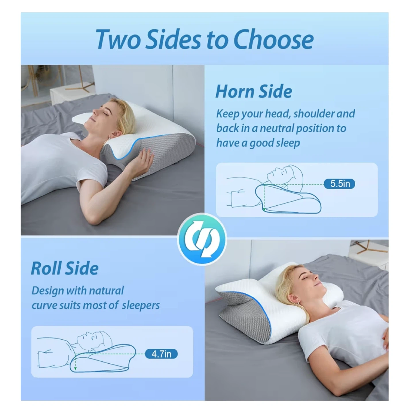 This contour memory foam pillow is designed for neck support and comfort. It features high-quality materials that are non-toxic, odorless, and skin-friendly. The pillow has two sides to choose from: a horn side and a roll side, each designed for different sleeping preferences. The horn side helps keep your head, shoulder, and neck in a neutral position, while the roll side is designed with natural curves to suit most sleepers