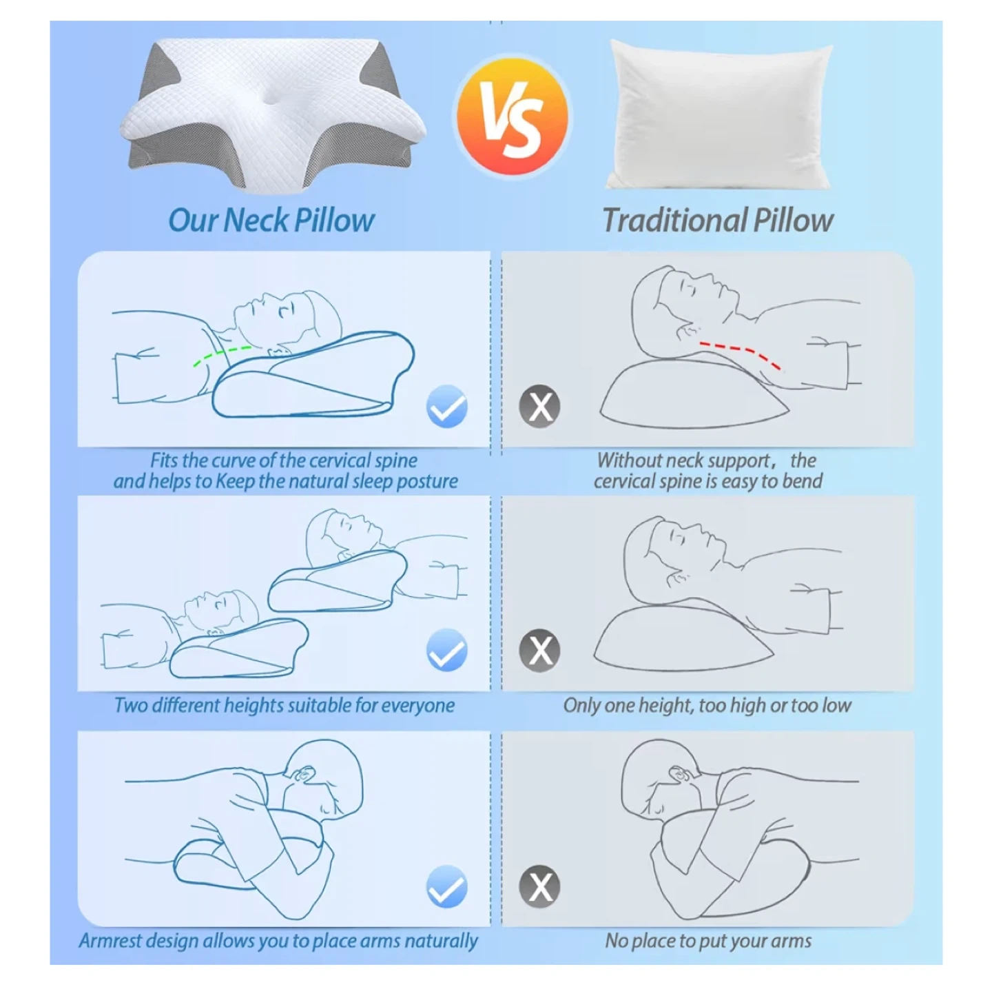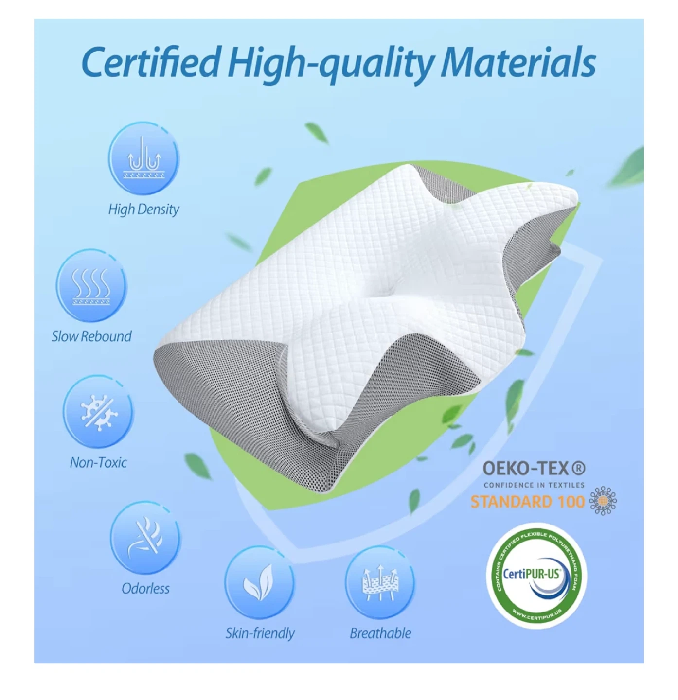 The horn side helps keep your head, shoulder, and back in a neutral position for a good night's sleep. The roll side is designed with a natural curve to suit most sleepers. It's made with certified high-quality materials, including high density, slow rebound, non-toxic, odorless, skin-friendly, and breathable materials
