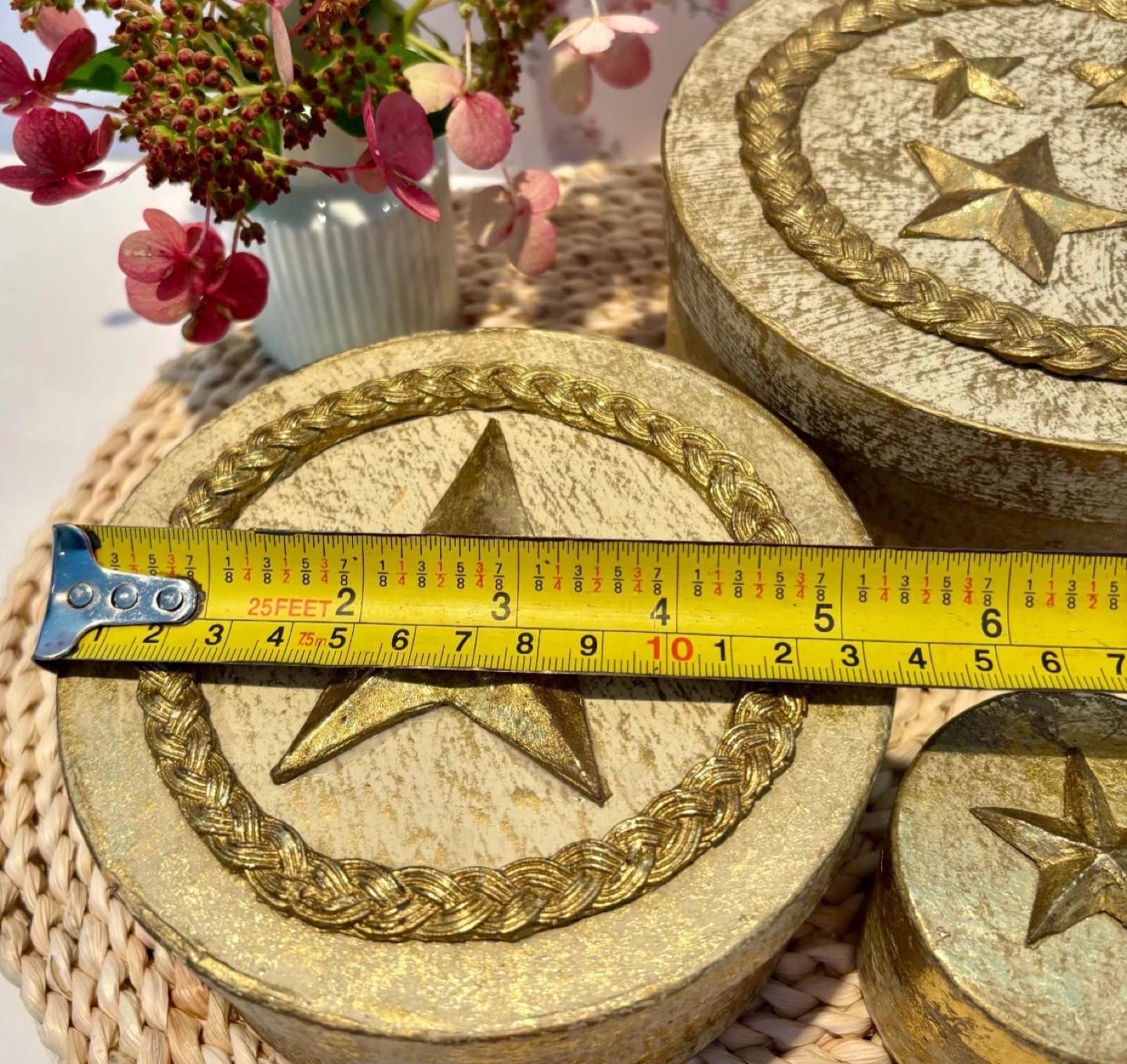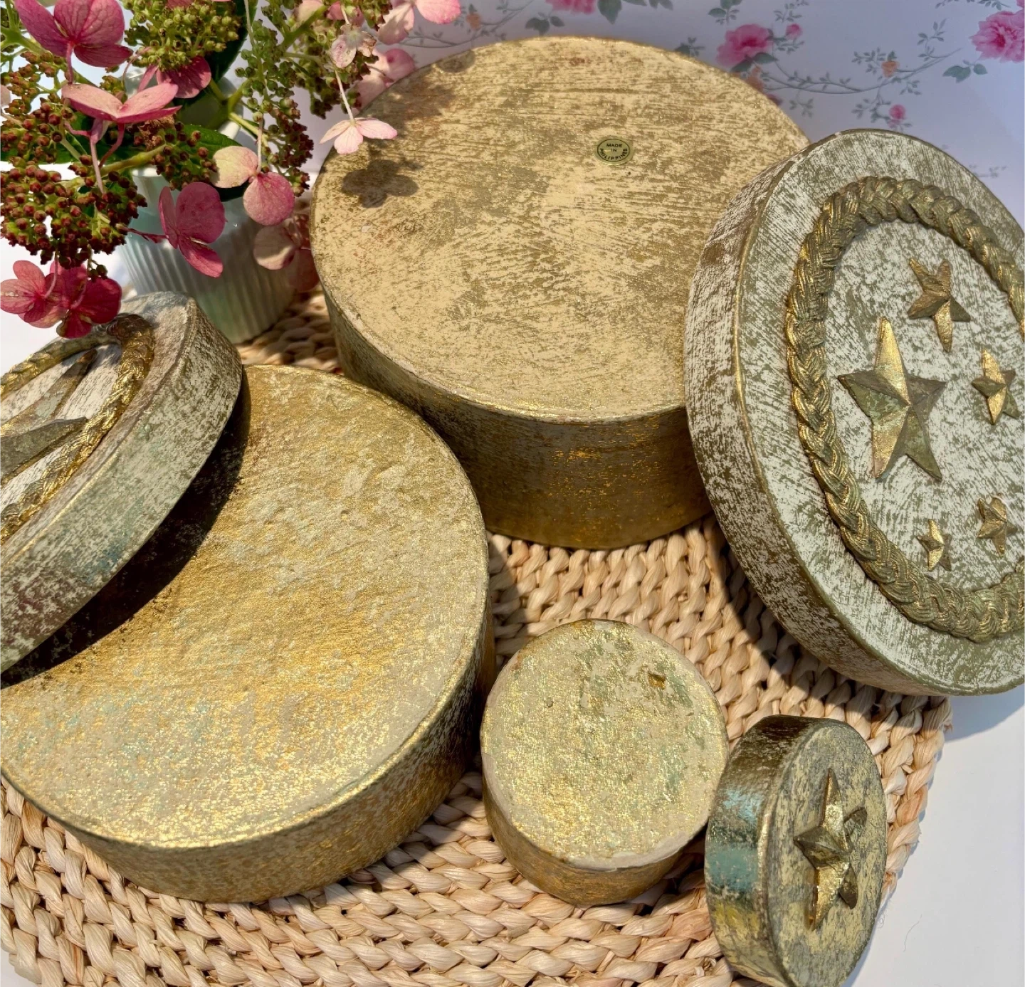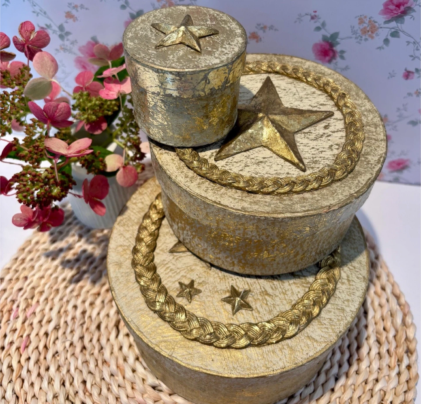 Here's a set of three decorative nesting boxes, perfect for adding a touch of sparkle to your space! They feature a lovely gold star design. The largest box measures about 7 inches in diameter, and the smallest is around 2 inches. They're in great condition and ready to find a new home!