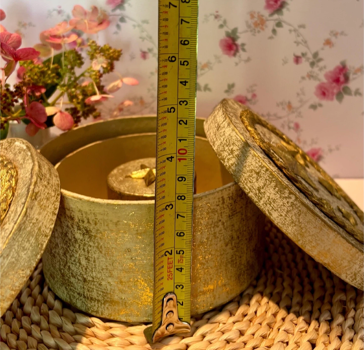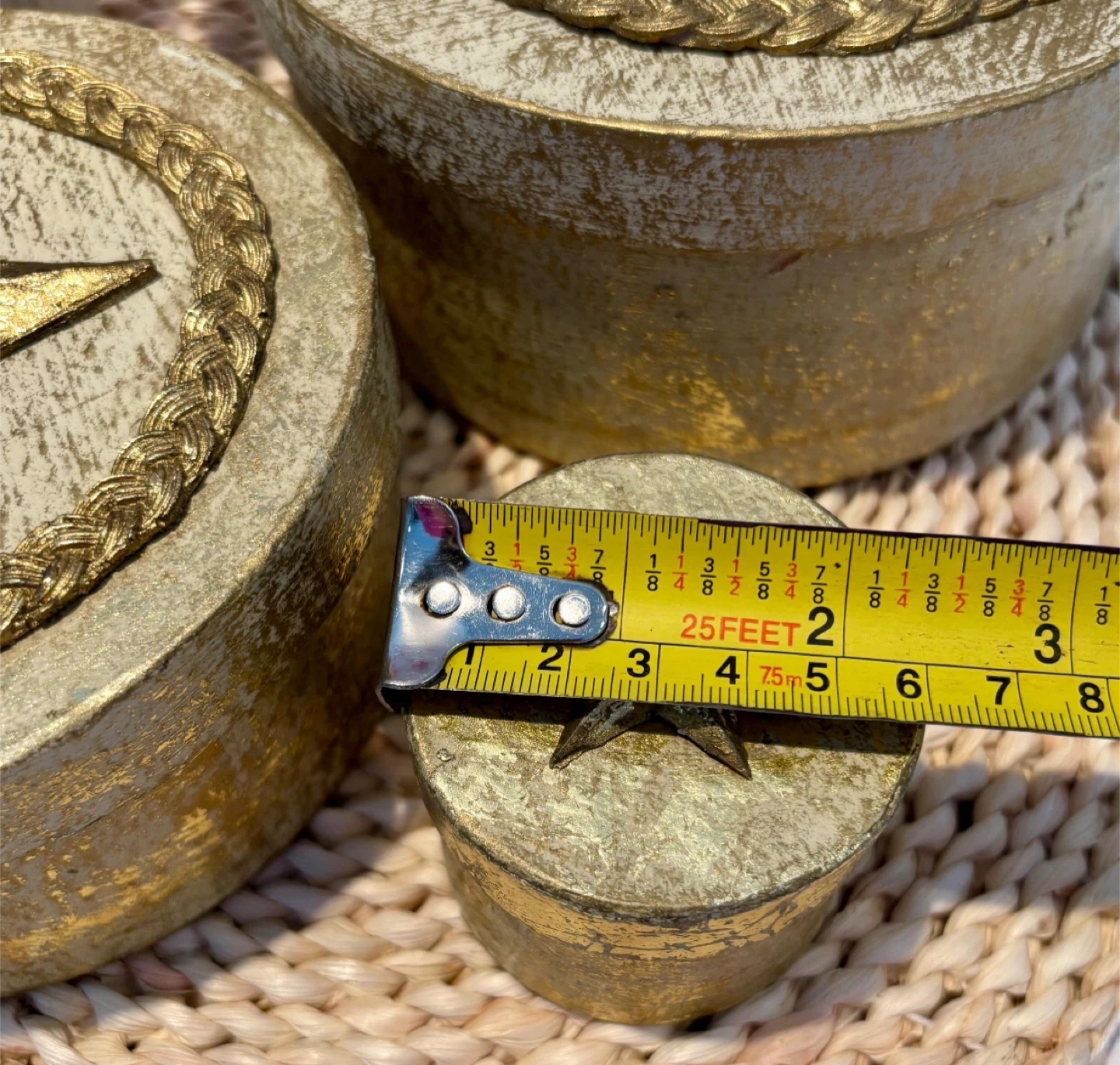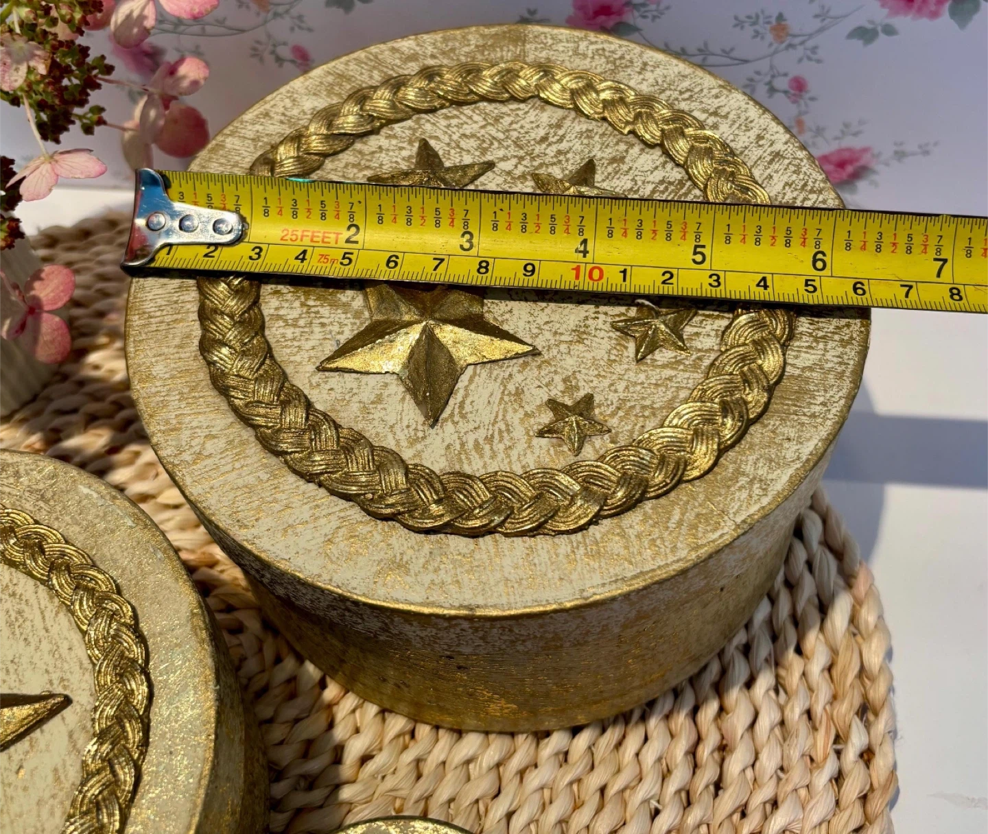 Here's a set of three decorative nesting boxes, perfect for adding a touch of sparkle to your space! They feature a lovely gold star design. The largest box measures about 7 inches in diameter, and the smallest is around 2 inches. They're in great condition and ready to find a new home!