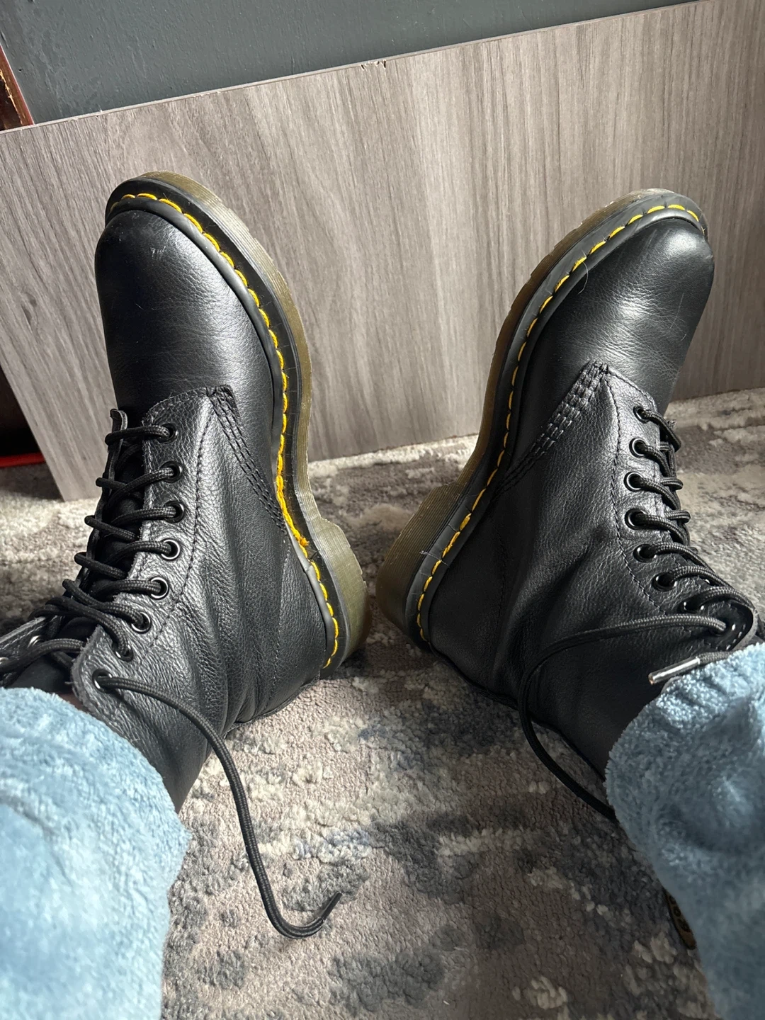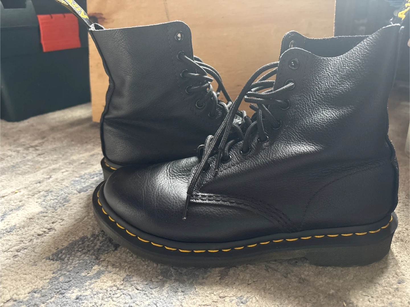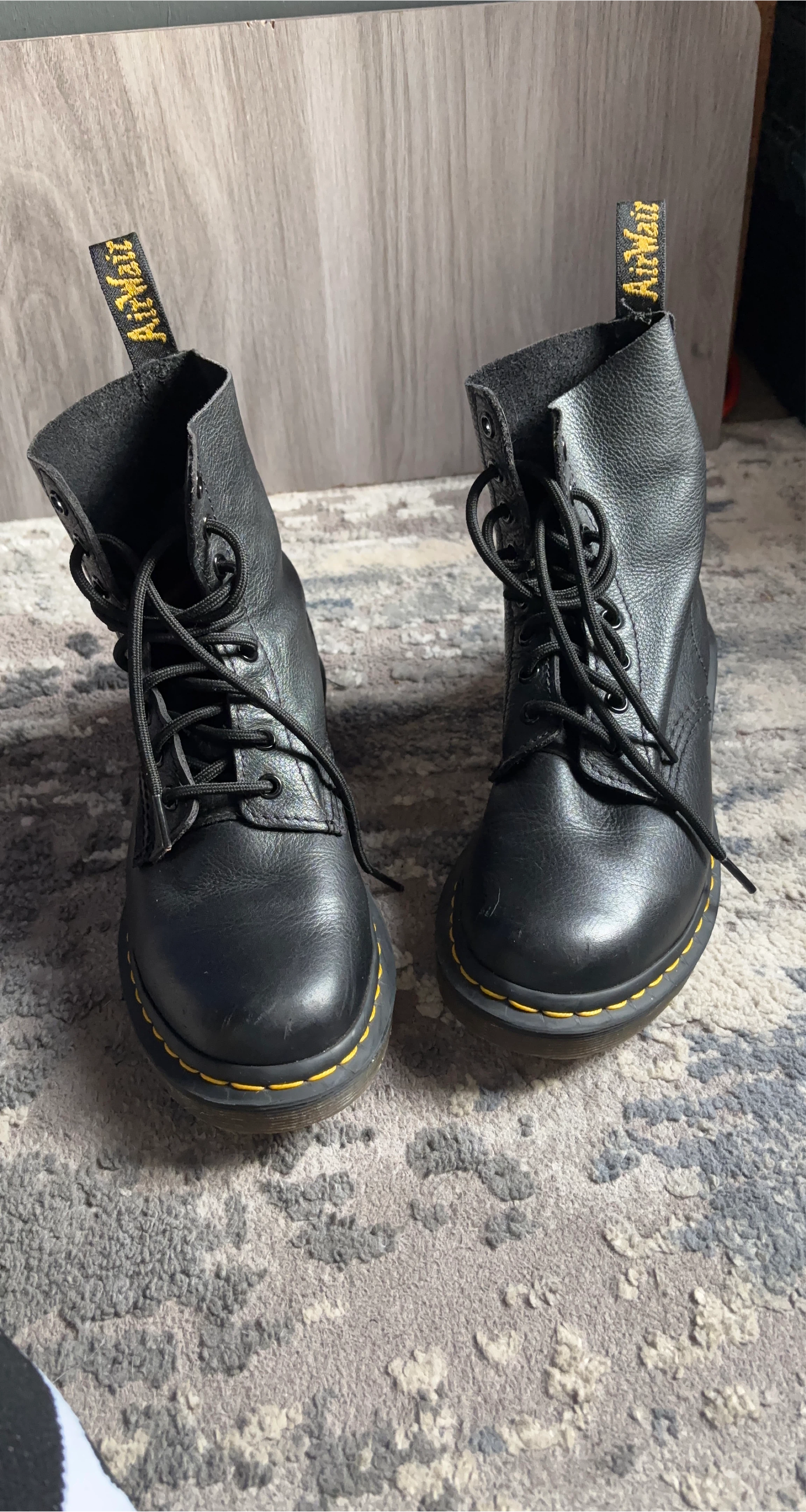 Selling a pair of Dr. Martens 1460 Pascal boots in black leather. These classic boots are in great condition and ready for a new home. They feature the iconic yellow stitching and durable construction that Dr. Martens are known for. Perfect for adding a touch of edge to any outfit!