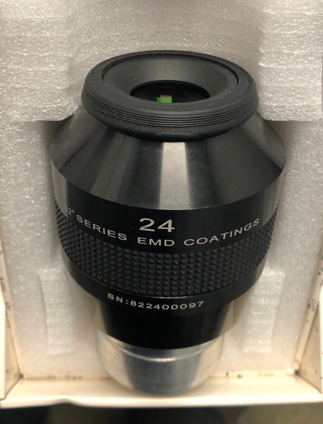 This is an Explore Scientific clone eyepiece lens for half the cost. Maxvision 24mm, 2", Wide Angle 82 degrees! Why spend over $600 plus tax when this one can be had for less than half the cost. High quality glass. I used it in my 18" dobsonian and it was my favorite eyepiece for expansive objects like M81 and M82, The Double Cluster, Andromeda Galaxy etc. Very nicely framed with zero eye strain! Selling because I no longer have my 18" scope. Comes with caps and box.