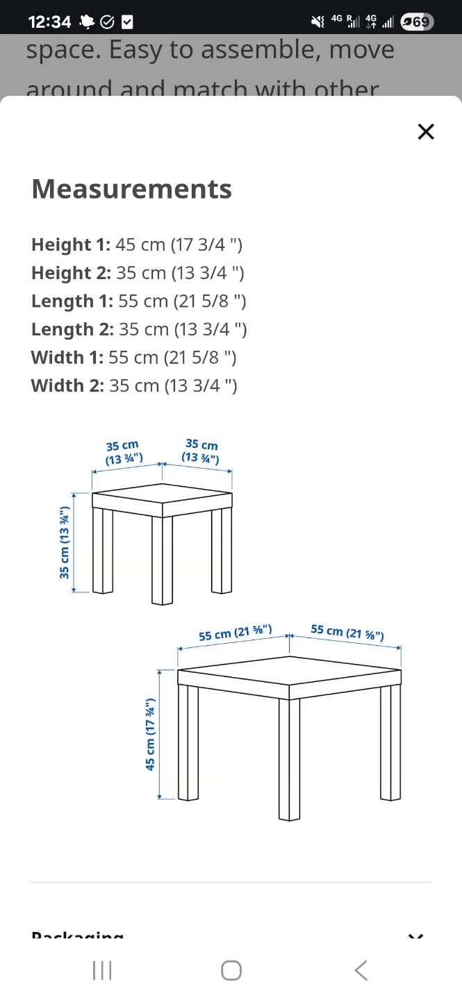 - Table 1: Height 45 cm (17 3/4 "), Length 55 cm (21 5/8 "), Width 55 cm (21 5/8 ")