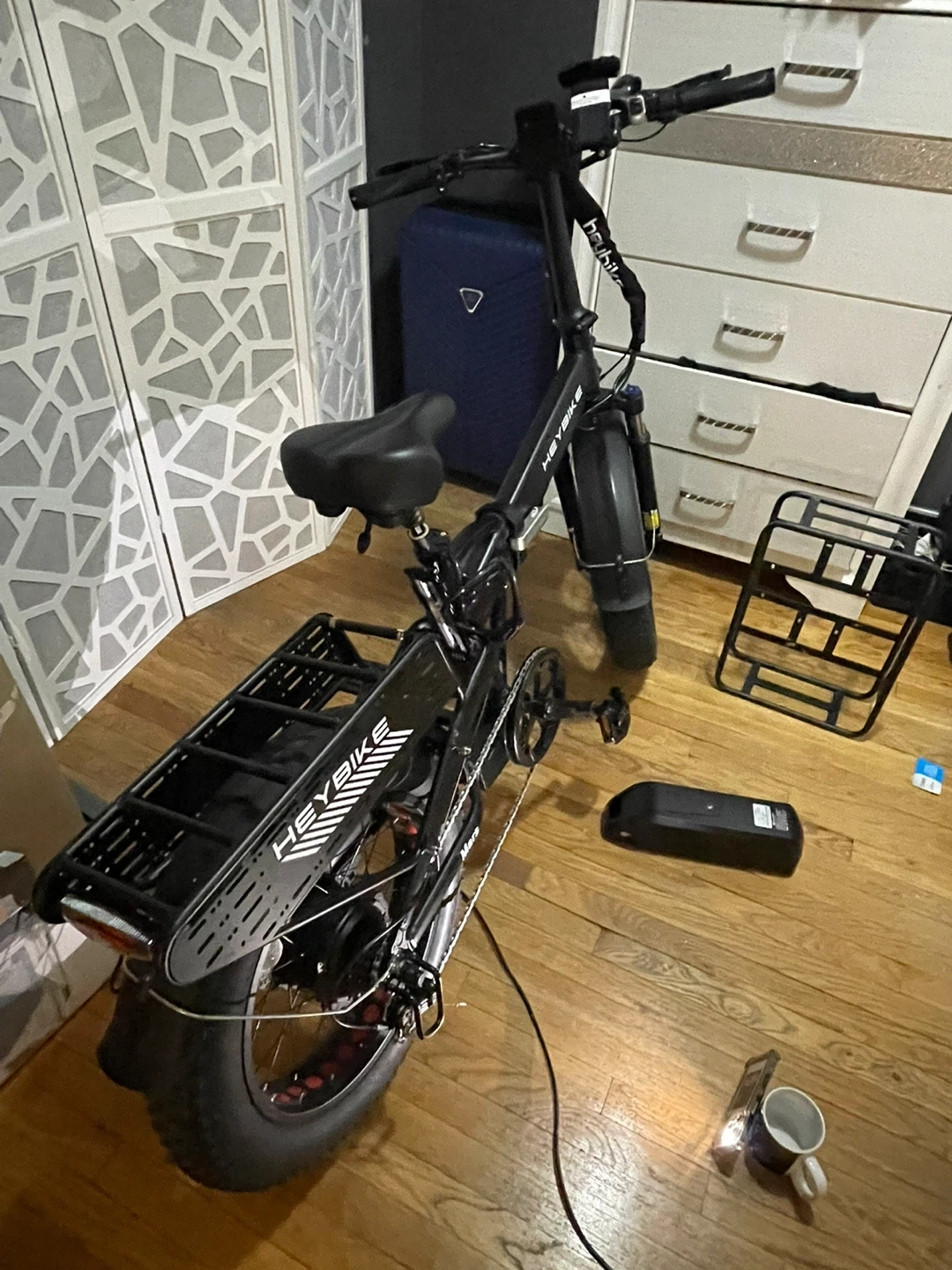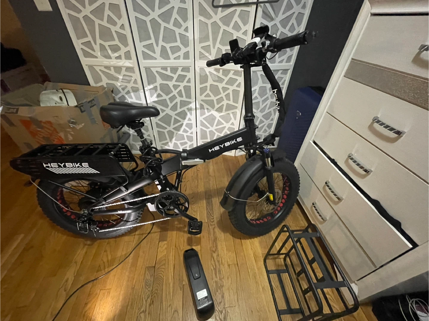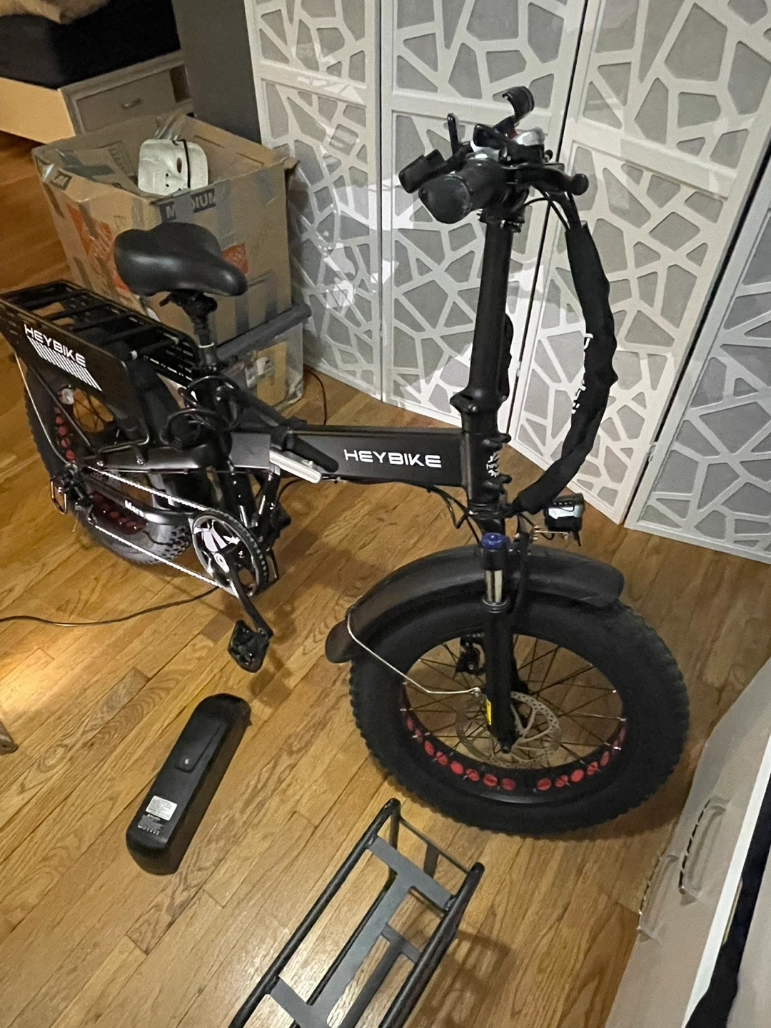 Selling a Heybike folding electric bike! It's in great condition and ready for a new owner. This bike comes with a Li-ion battery and a rear rack for carrying your belongings. It's perfect for commuting or leisurely rides around town. Also comes with a lock for the bike, and a professional helmet!