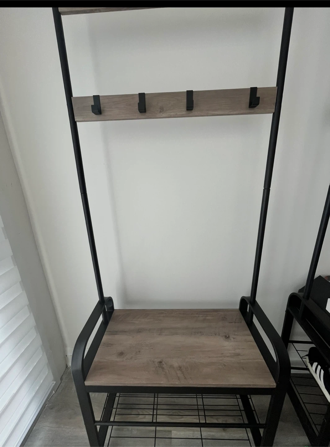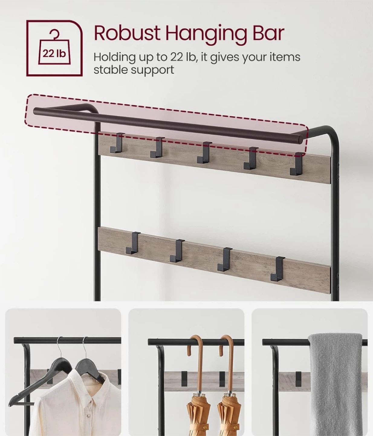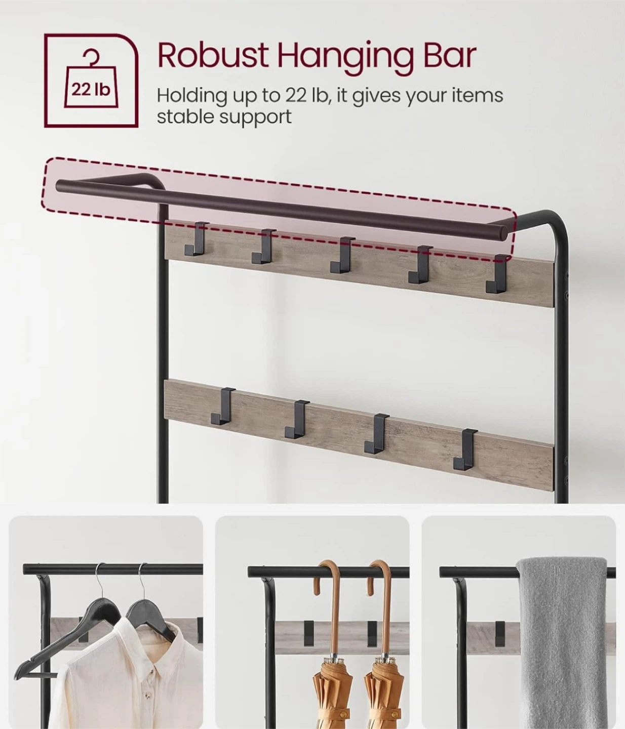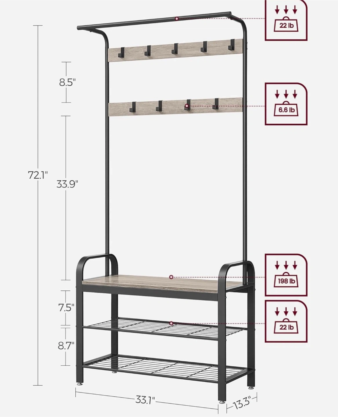 I have 2 of these, This hall tree comes with 9 removable hooks for easy access to your items. The robust hanging bar can hold up to 22 lb, providing stable support. It also features a stable bench with handles for changing shoes with ease. Dimensions are approximately 72.1" (height) x 33.1" (width) x 13.3" (depth).