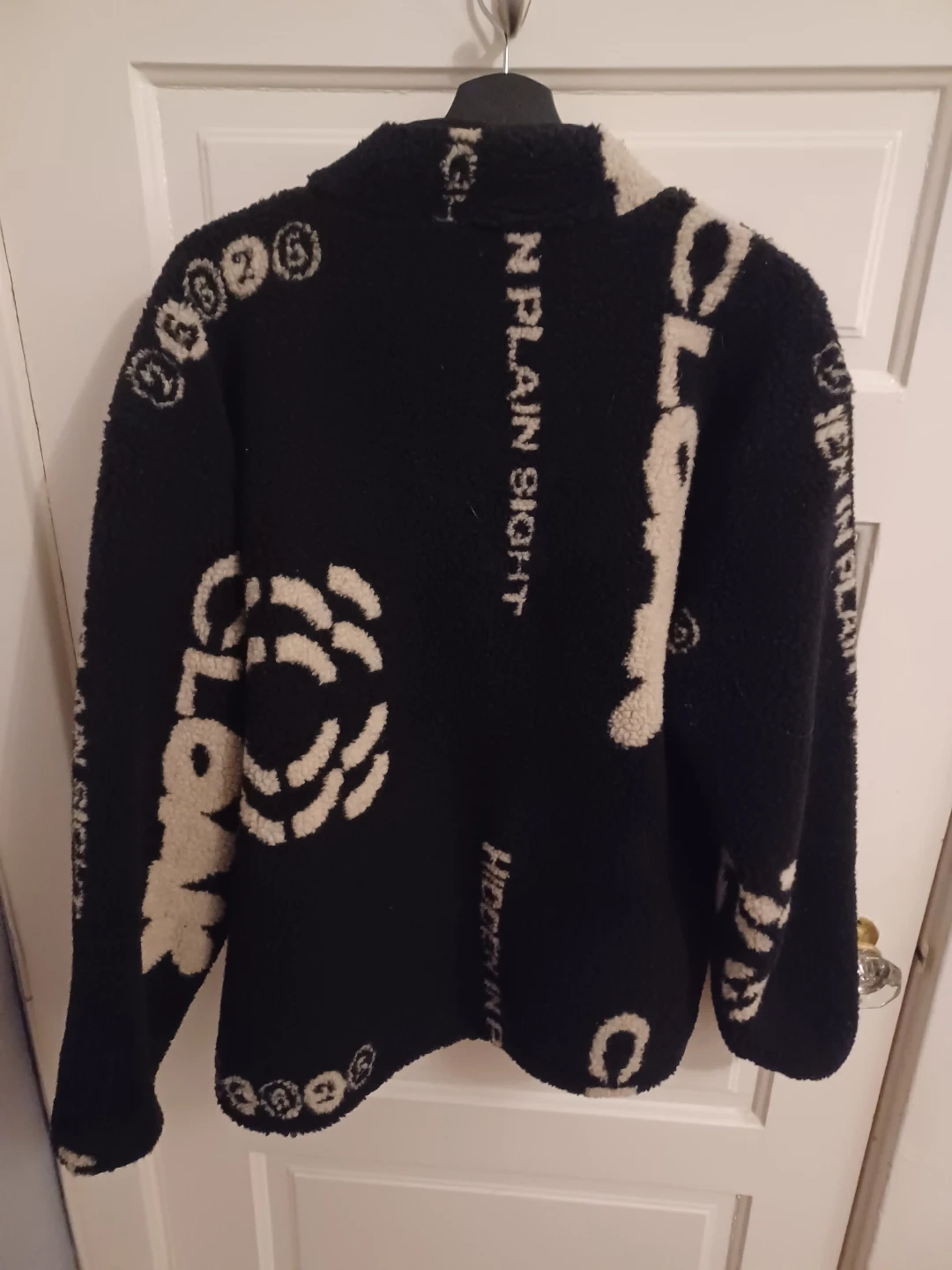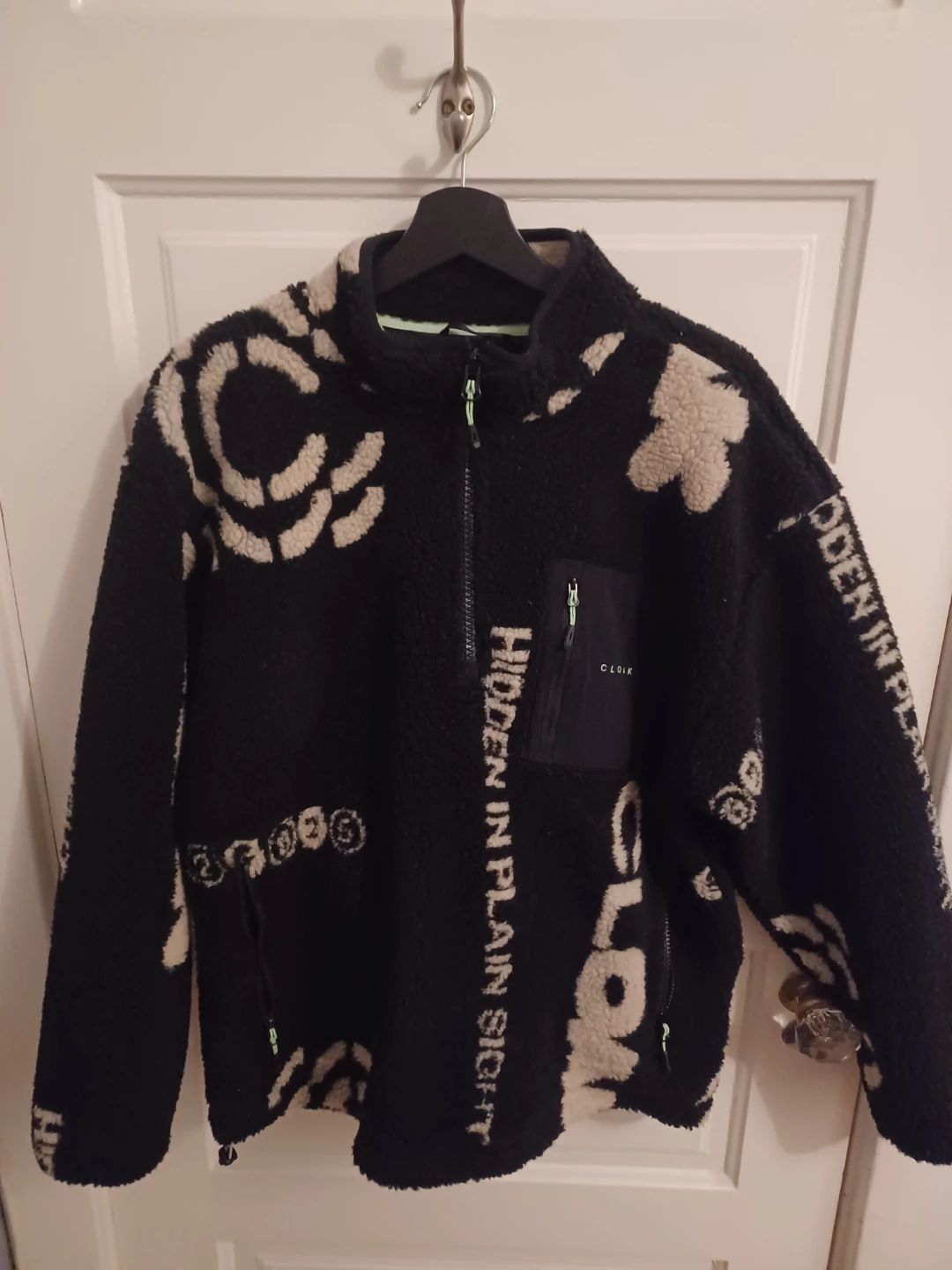 Cozy CLOAK fleece jacket in size medium! It's black with a unique design. Great for staying warm and stylish.