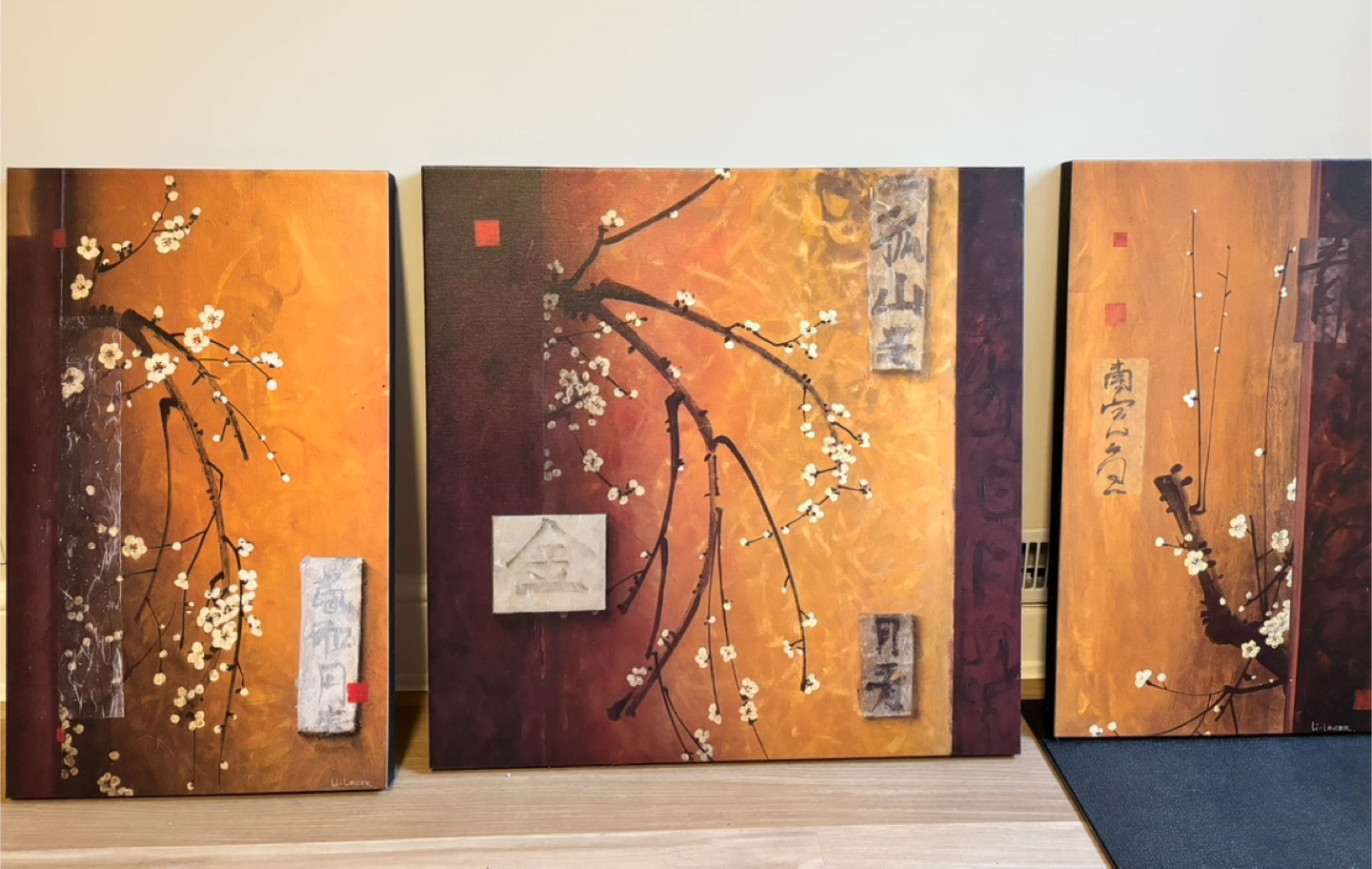 A set of three canvas wall art pieces. They feature a Asian floral design (cherry blossom- Sapporo) with a warm colour palette. Perfect for adding a touch of elegance to any room!