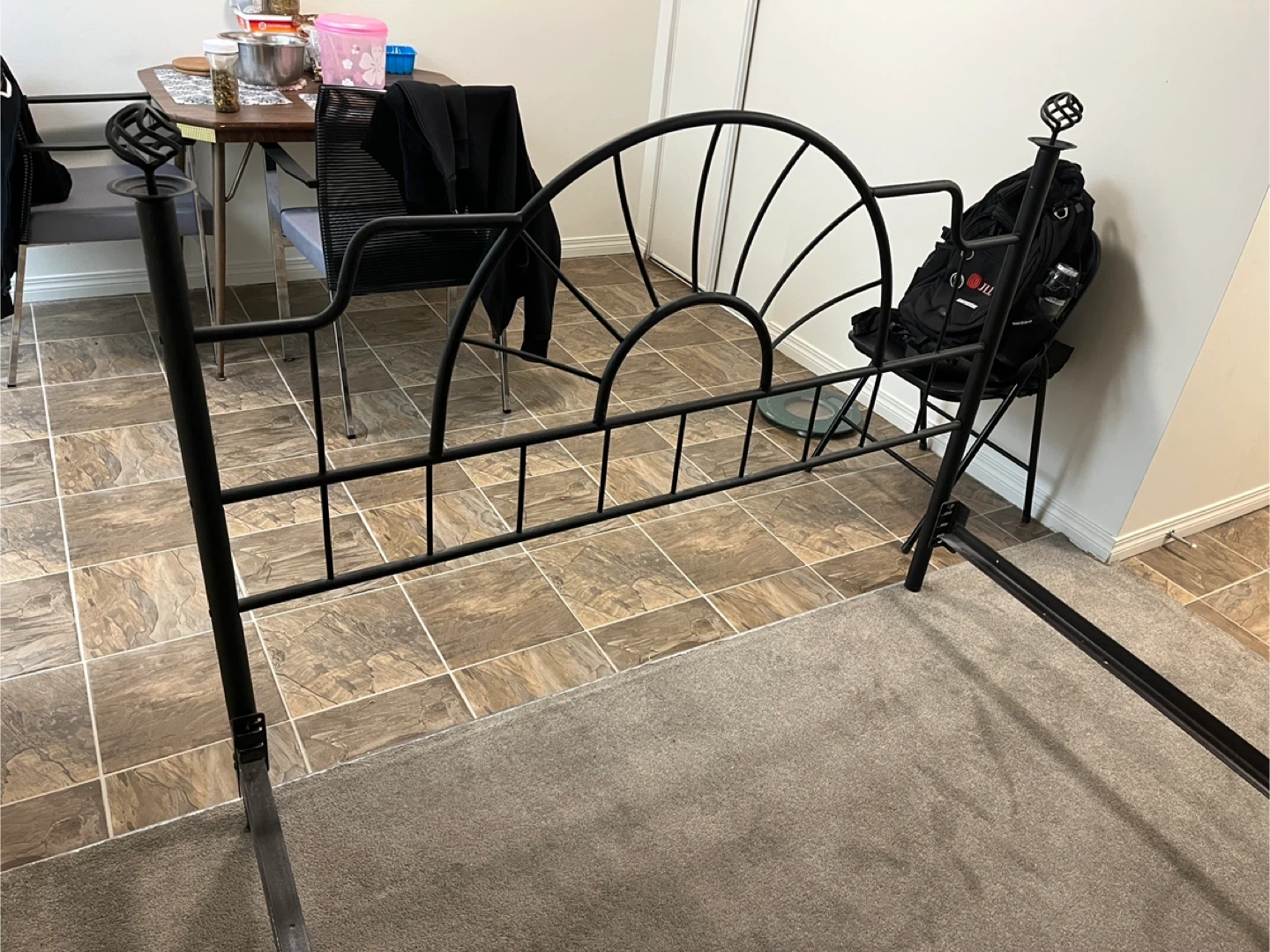 Selling a black metal bed frame. It's in good condition and ready for a new home! Perfect for adding a touch of elegance to your bedroom. Comes with all the necessary parts for easy assembly. Queen size . Bring cash only. First come first serve.