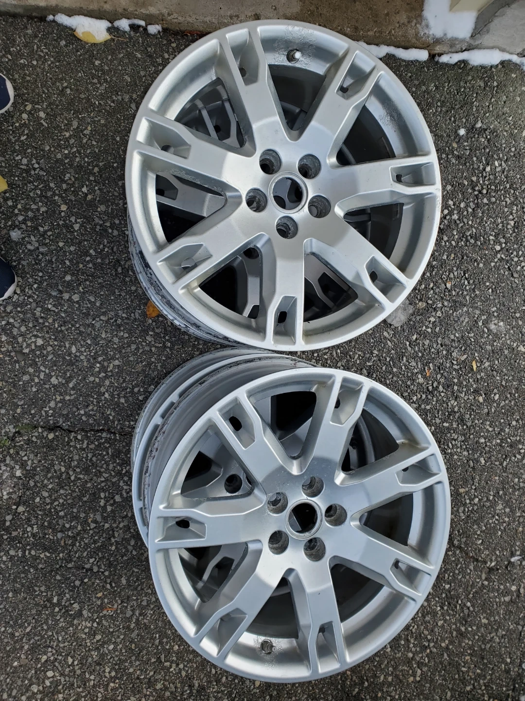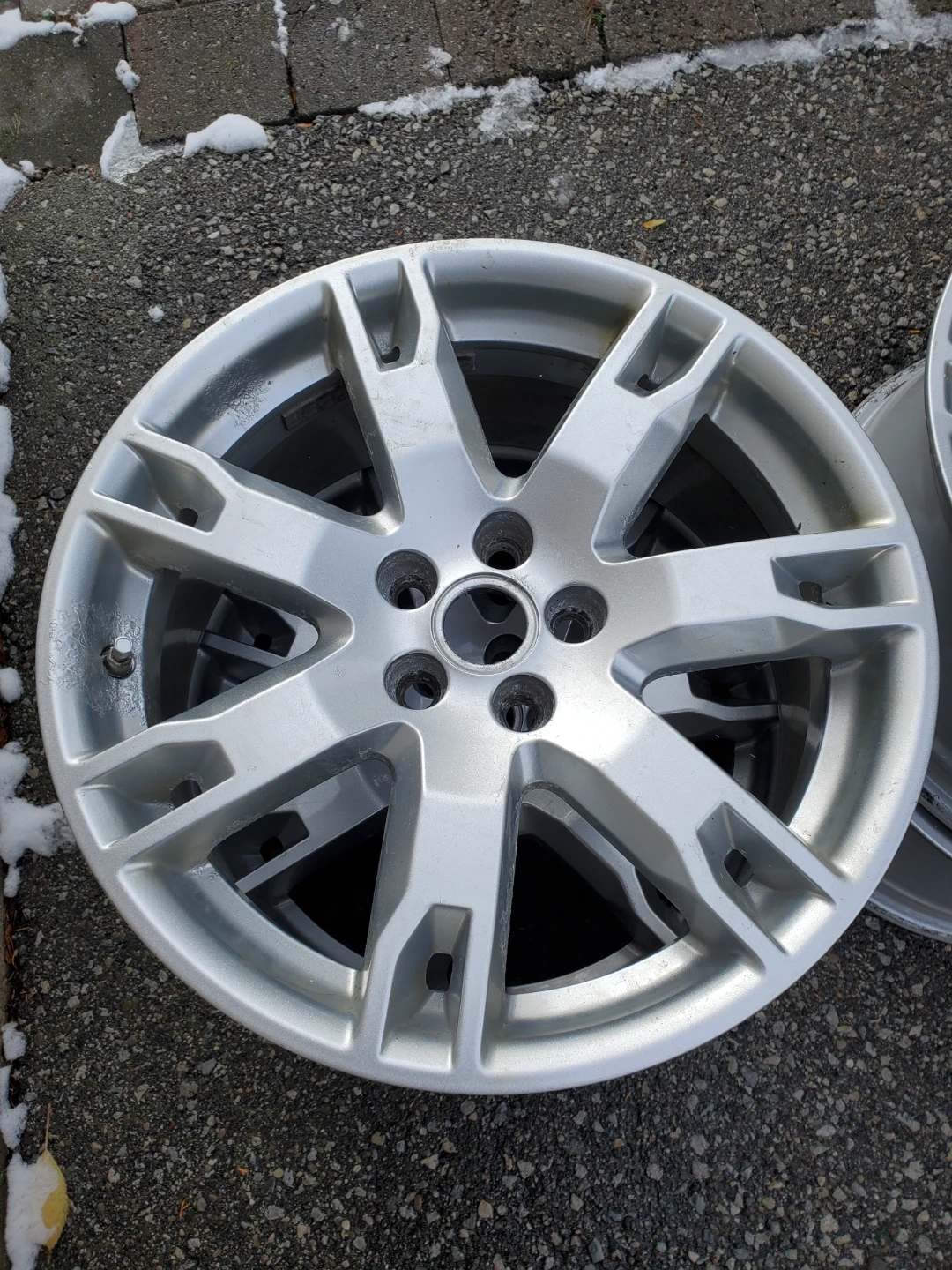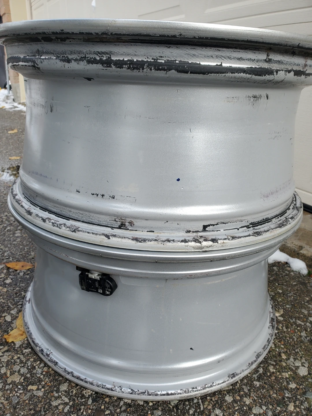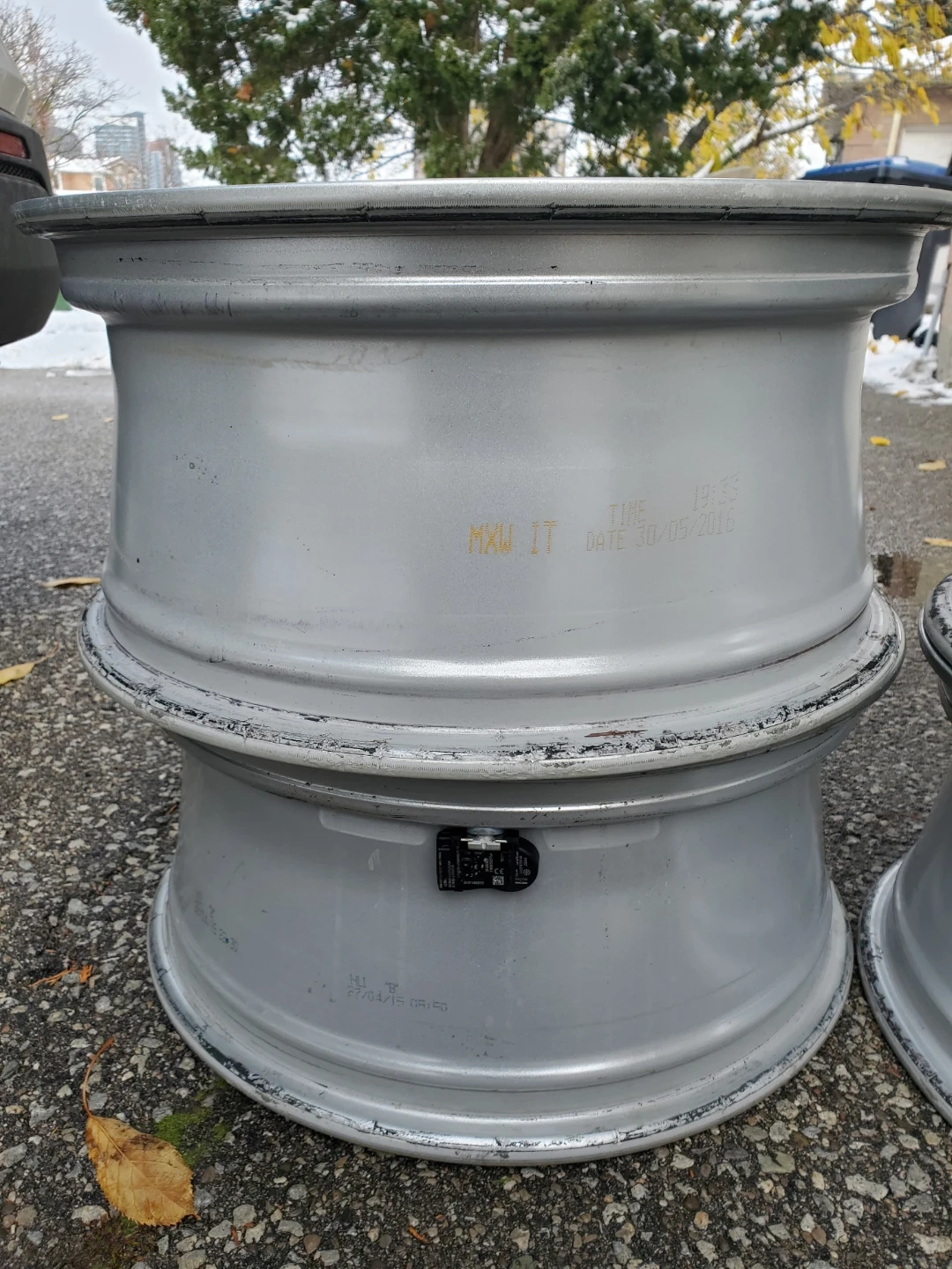 Selling a set of four used 18 imch silver alloy car rims with Tire Pressure Sensors. Off from Land Rover Discovery. They show signs of wear and tear as pictured.