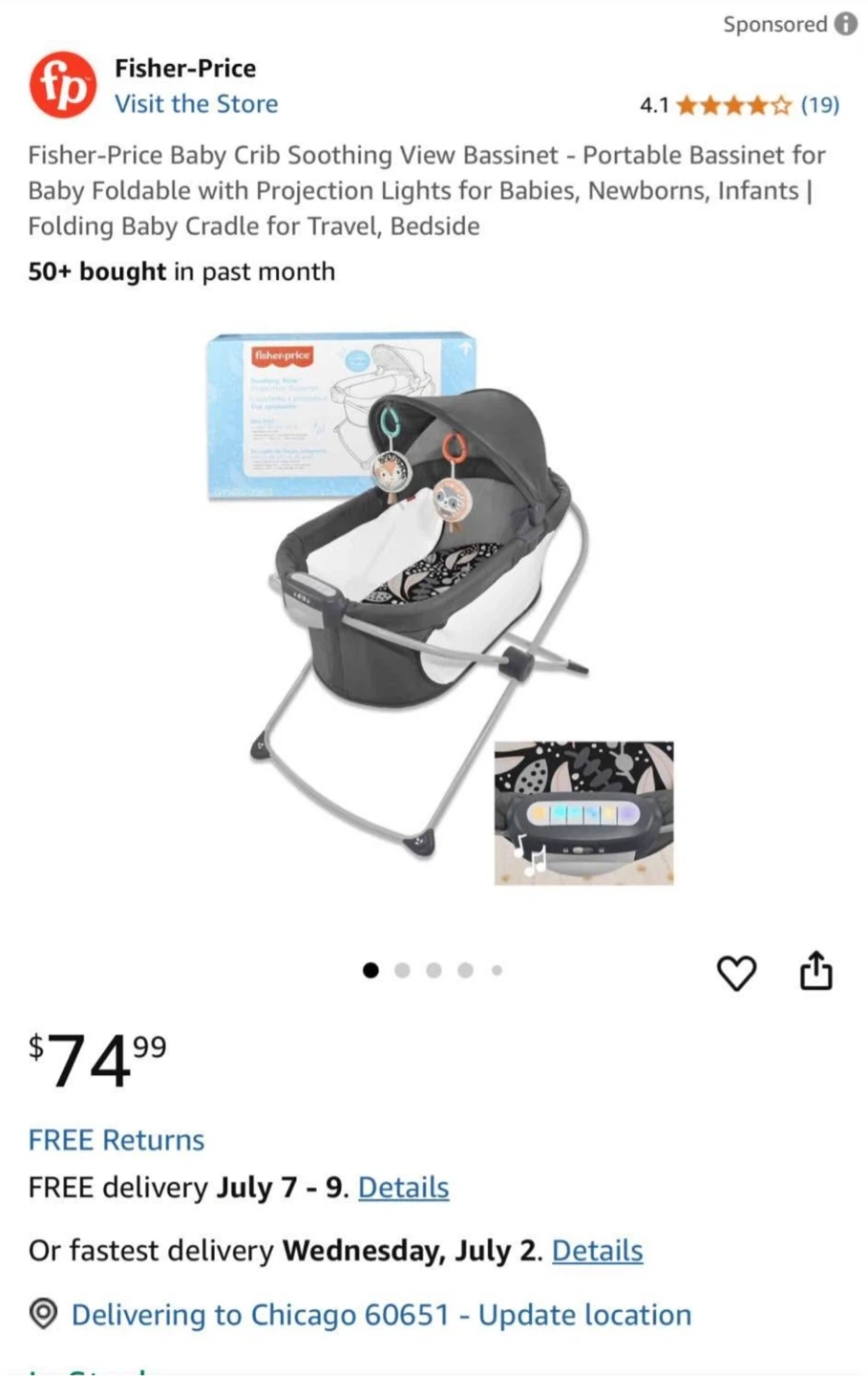 Selling a Fisher-Price Baby Crib Soothing View Bassinet. It's a portable bassinet perfect for babies, newborns, and infants. It's foldable with projection lights and ideal for travel or bedside use. Originally bought for $74.99!