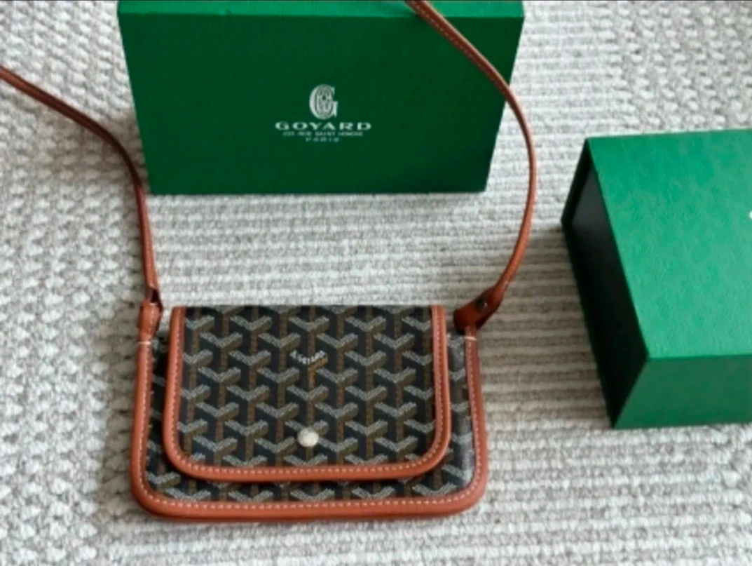This is a Goyard crossbody bag with brown leather trim. It features the classic Goyard pattern. It comes with its original box!
