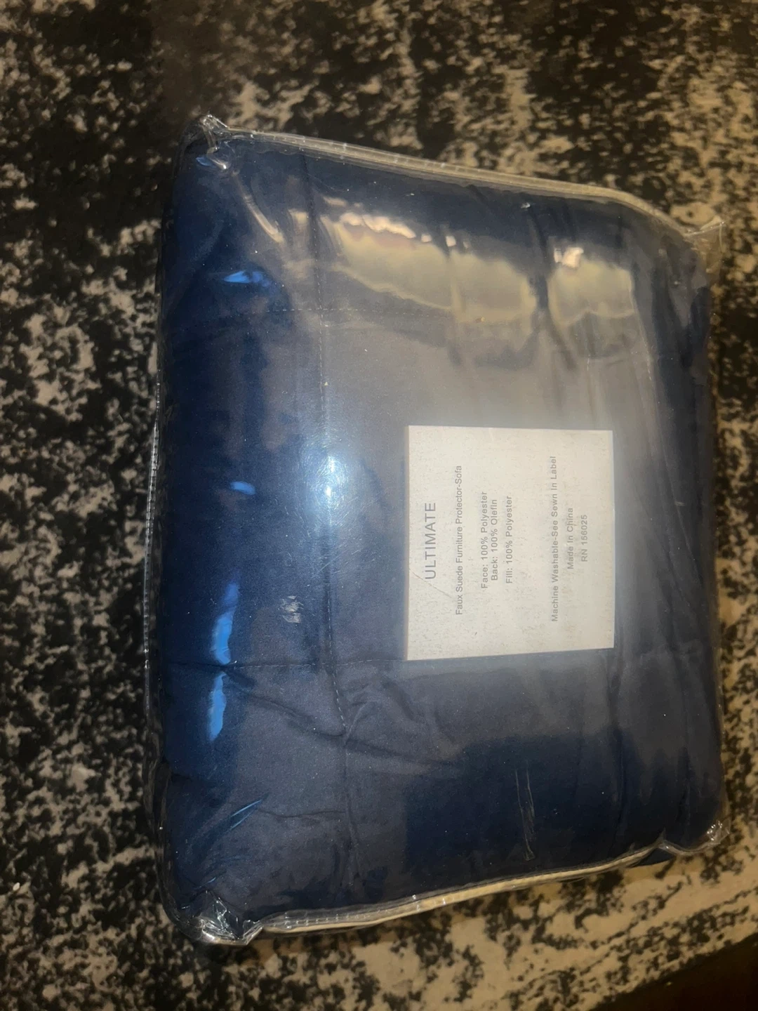 I'm selling a navy blue Ultimate Faux Suede Furniture Protector for a sofa. It's still in its original packaging and has never been used!