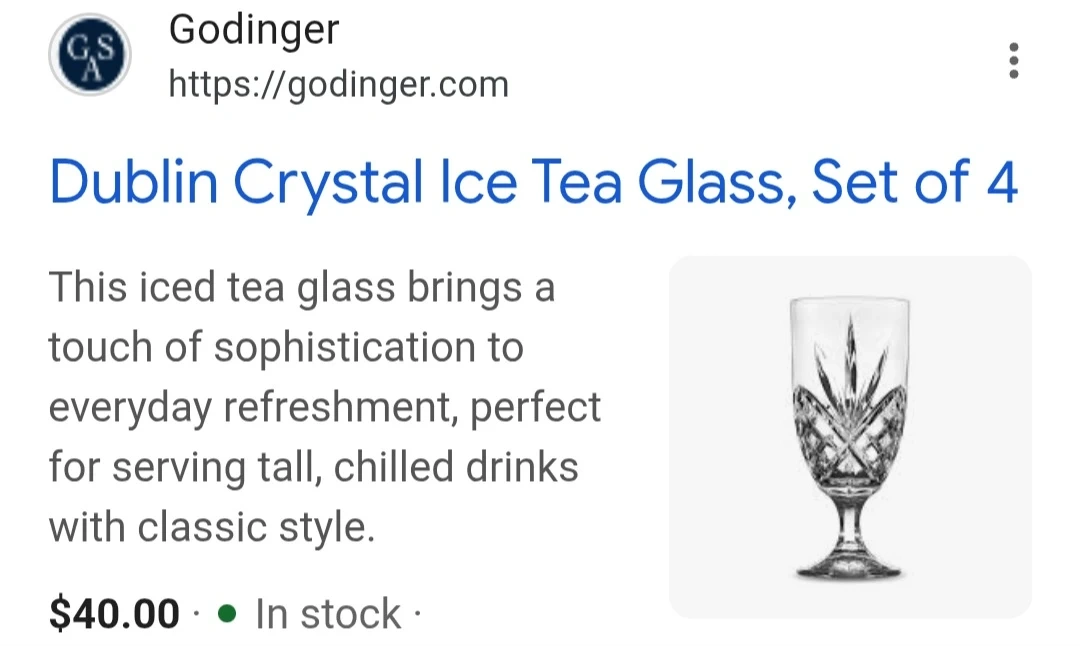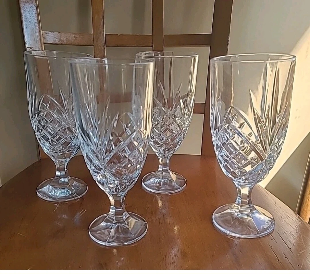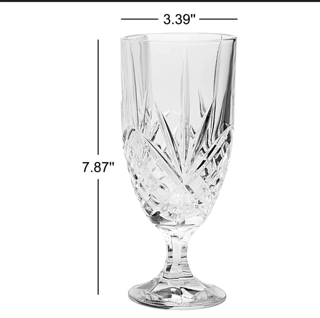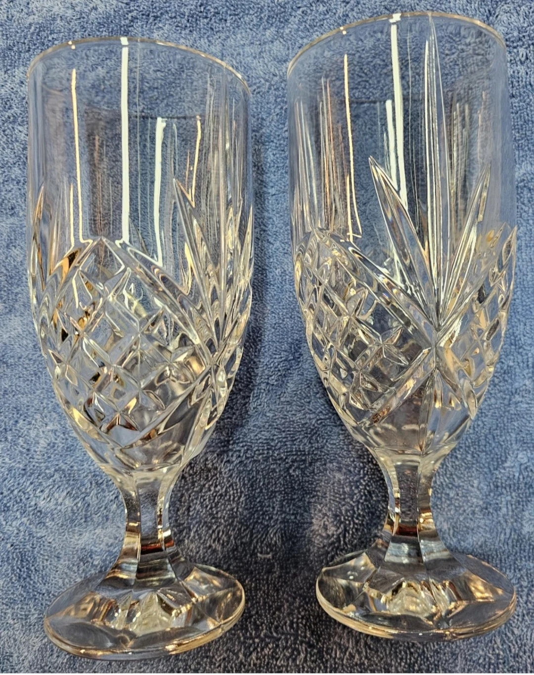20 never used they were extra pieces I had. Godinger Dublin brand beverage glasses.. Large 16 ounces. Thick heavy crystal. 8 inches tall.