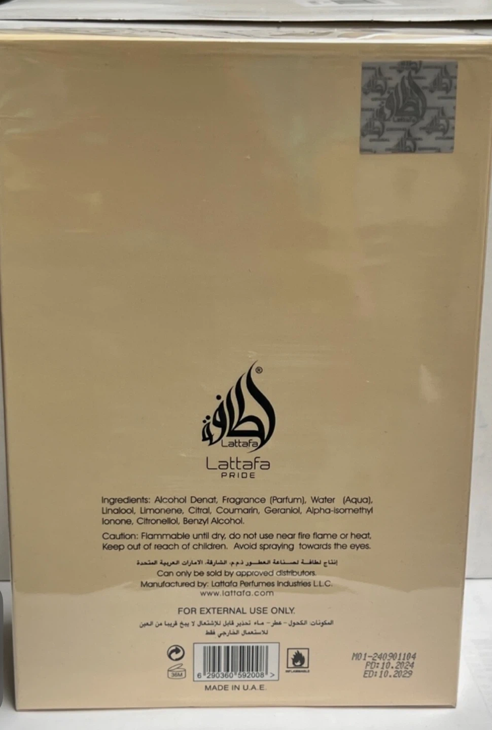 Selling a Lattafa Pride Art of Nature I Eau de Parfum, 100ml. The box includes the ingredients, such as Alcohol Denat, Fragrance (Parfum), and Water (Aqua). It's a natural spray, made in the U.A.E.
