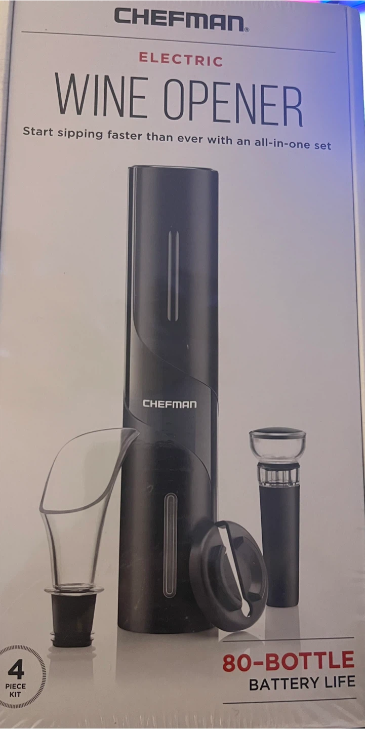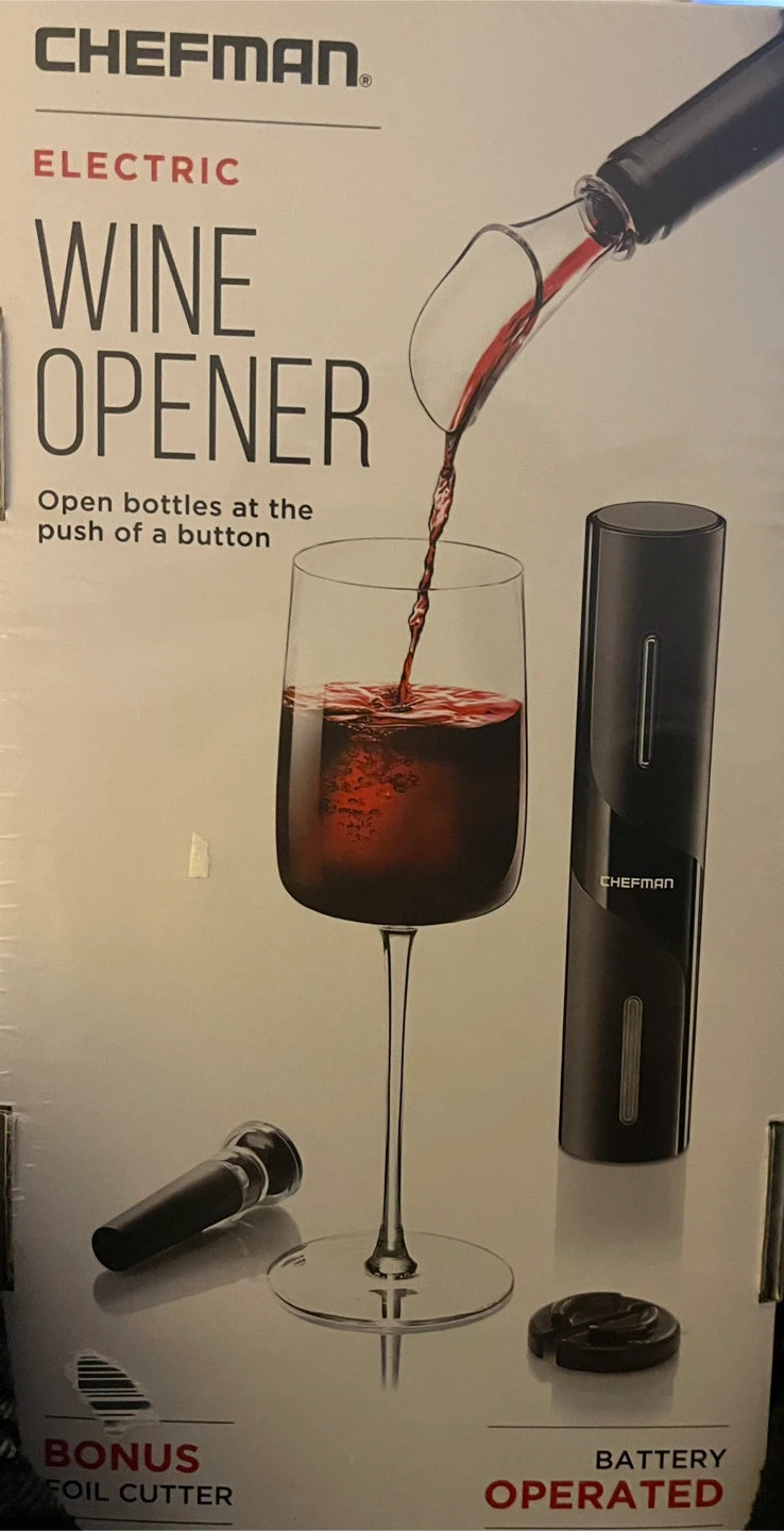 I'm selling a brand new Chefman electric wine opener! It comes in its original packaging and includes all the components. It's battery operated and even comes with a bonus foil cutter.