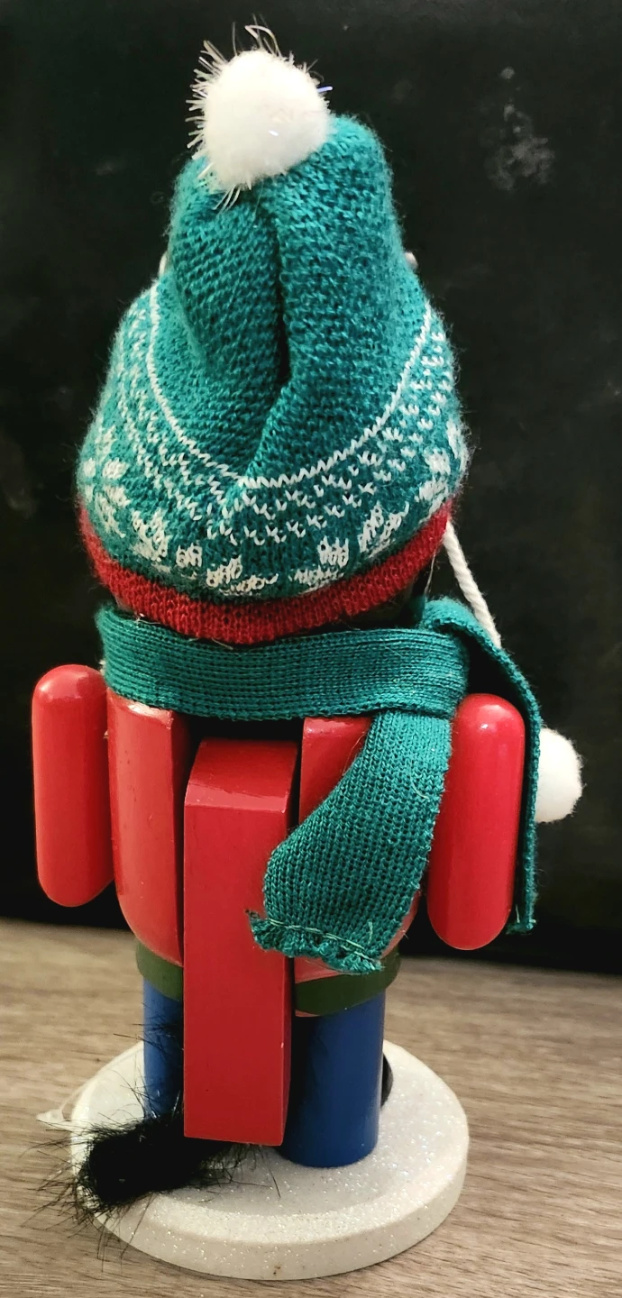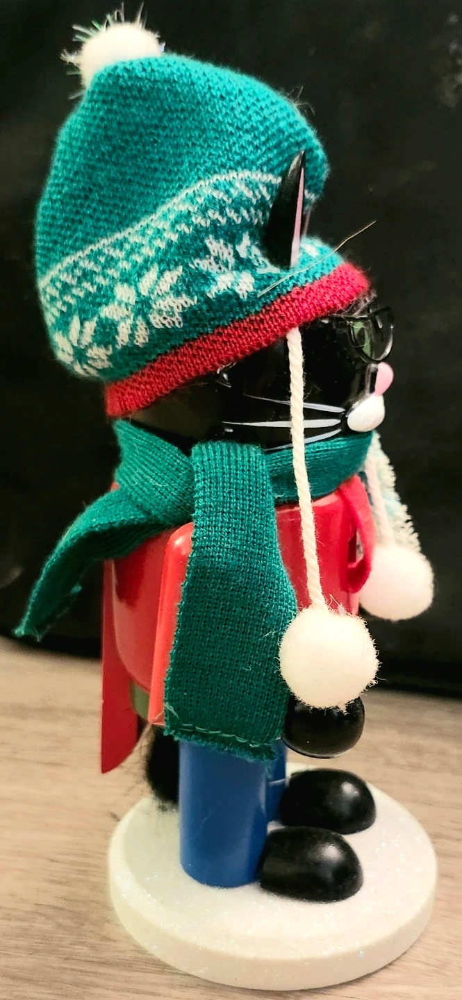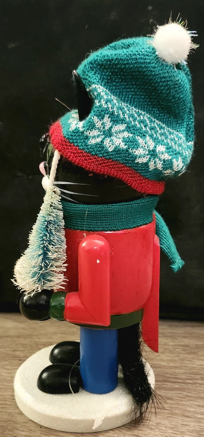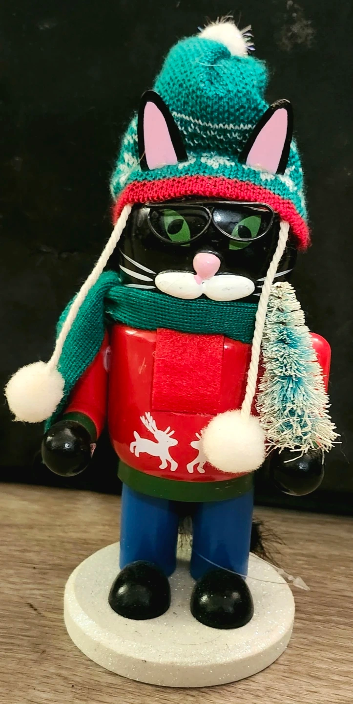 Add some feline flair to your festive decor with this adorable Christmas cat nutcracker! This charming piece features a black cat dressed in a winter hat, scarf and a red sweater, complete with a miniature Christmas tree. It is in used condition. This delightful nutcracker will surely bring a smile to your face every holiday season.