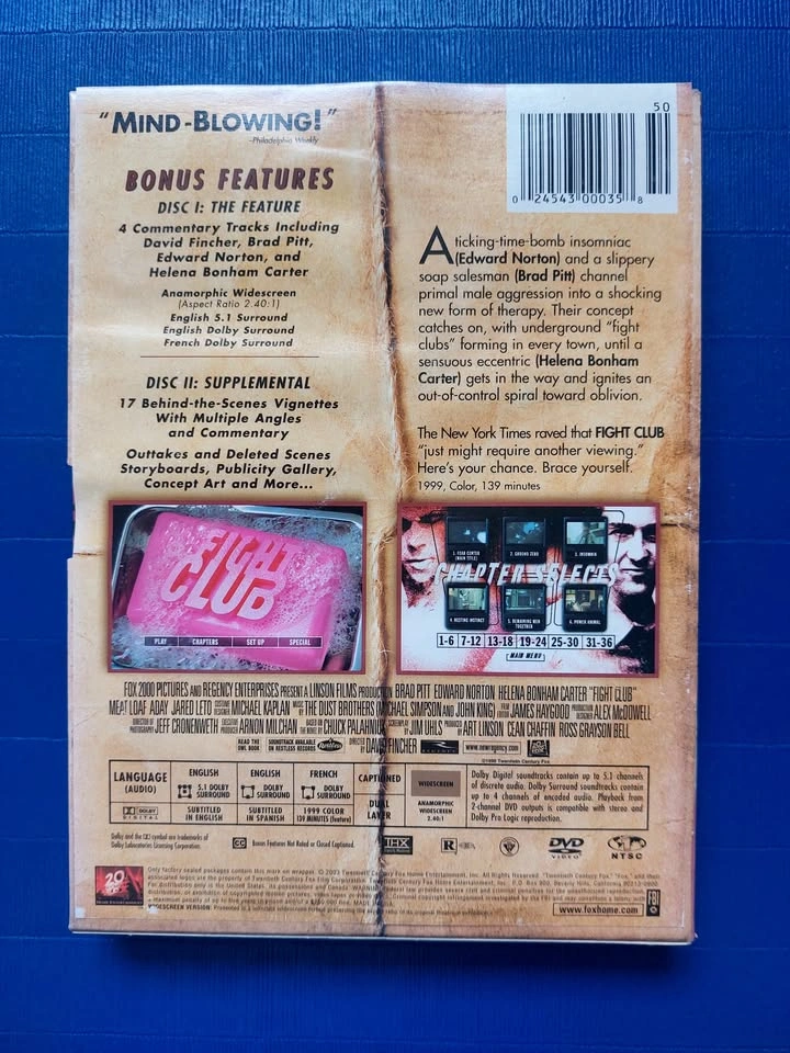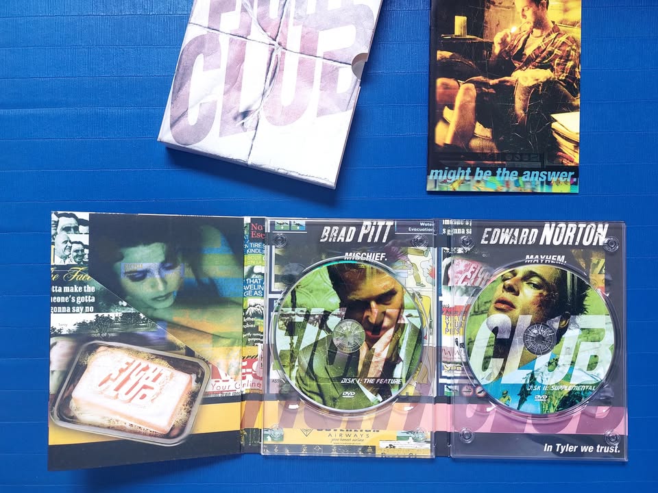This is a like-new copy of the 2-disc collector’s edition DVD of Fight Club. Includes four commentary tracks, deleted scenes, booklet, and lots of other content! A must for anyone in your life who does not talk about Fight Club.