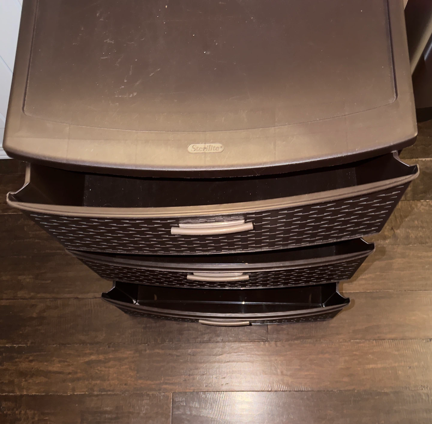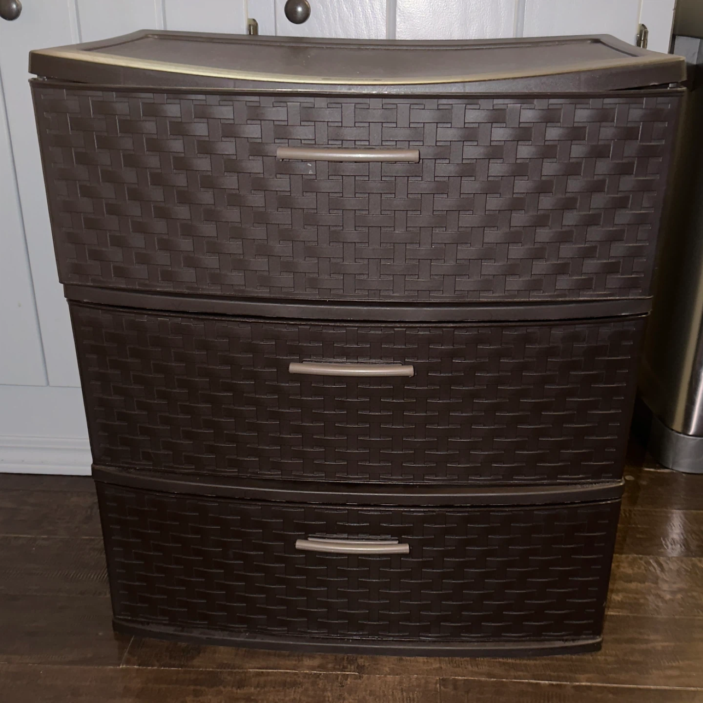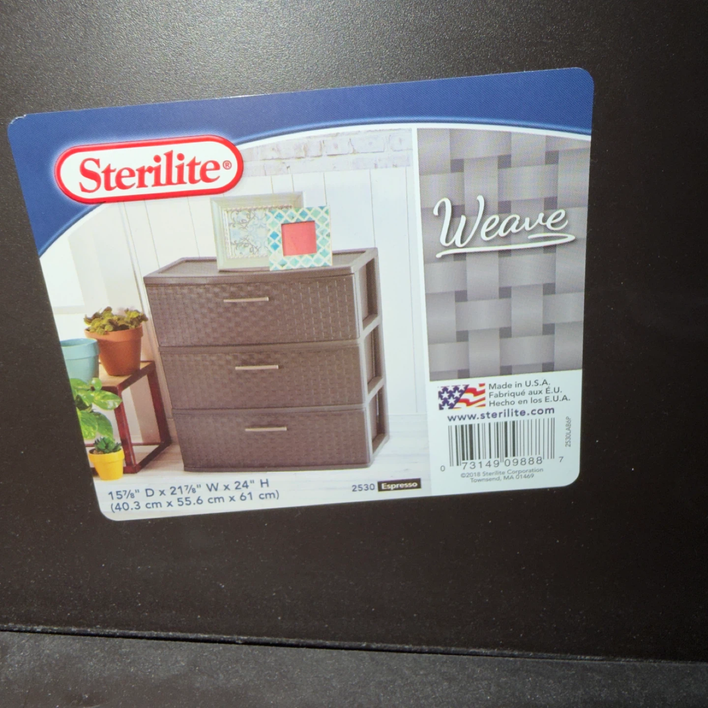 I'm selling a Sterilite Weave 3-Drawer unit in Espresso color. It's perfect for adding storage to any room. The dimensions are 15 ⅝" D x 21 ⅞" W x 24" H (40.3 cm x 55.6 cm x 61 cm).