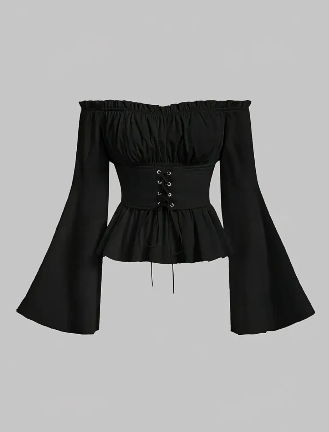 This is a beautiful black off-shoulder corset top with bell sleeves. It's in great condition and would be a lovely addition to any wardrobe!