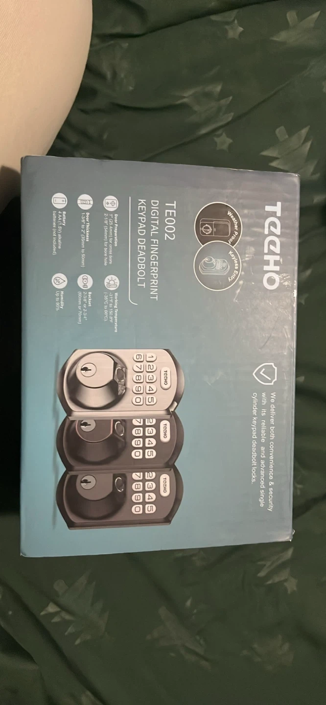 Selling a Techo Digital Fingerprint Keypad Deadbolt, model TE002! It delivers both convenience and security with its reliable and advanced simple cylinder keypad deadbolt locks. The battery is a 4 x AAA 1.5V alkaline (batteries not included). It's waterproof and fits most standard US doors 1-3/8" to 2-1/8" (35mm to 55mm)