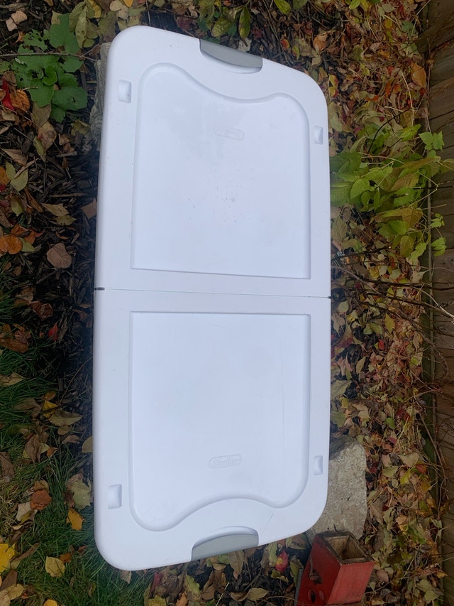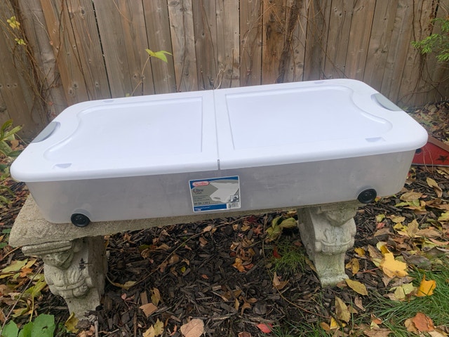I'm selling a used Sterilite Ultra latch wheeled underbed box, perfect for extra storage with a 66 Qt. / 62 L capacity and dimensions of 39 1/2" x 20 1/4" x 7" (100.3 cm x 51.4 cm x 17.8 cm). This handy container has a small crack on the lid. Please see the photos for condition.