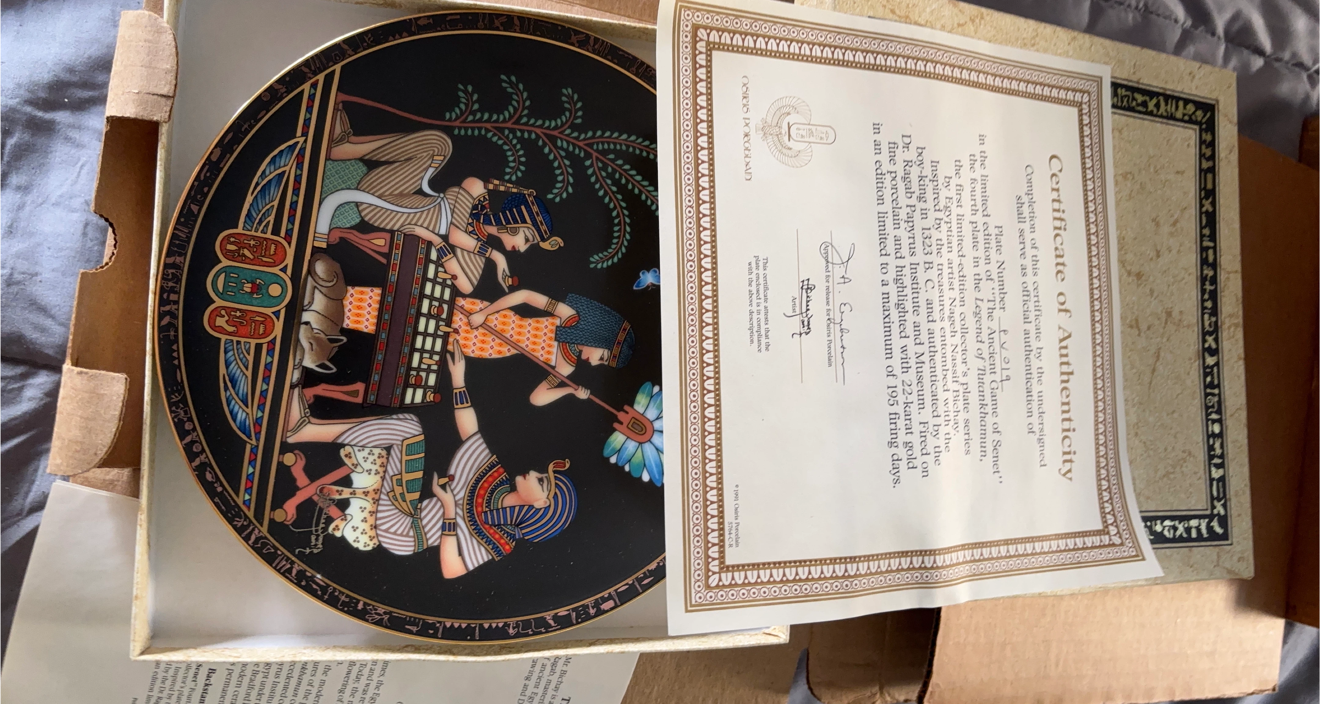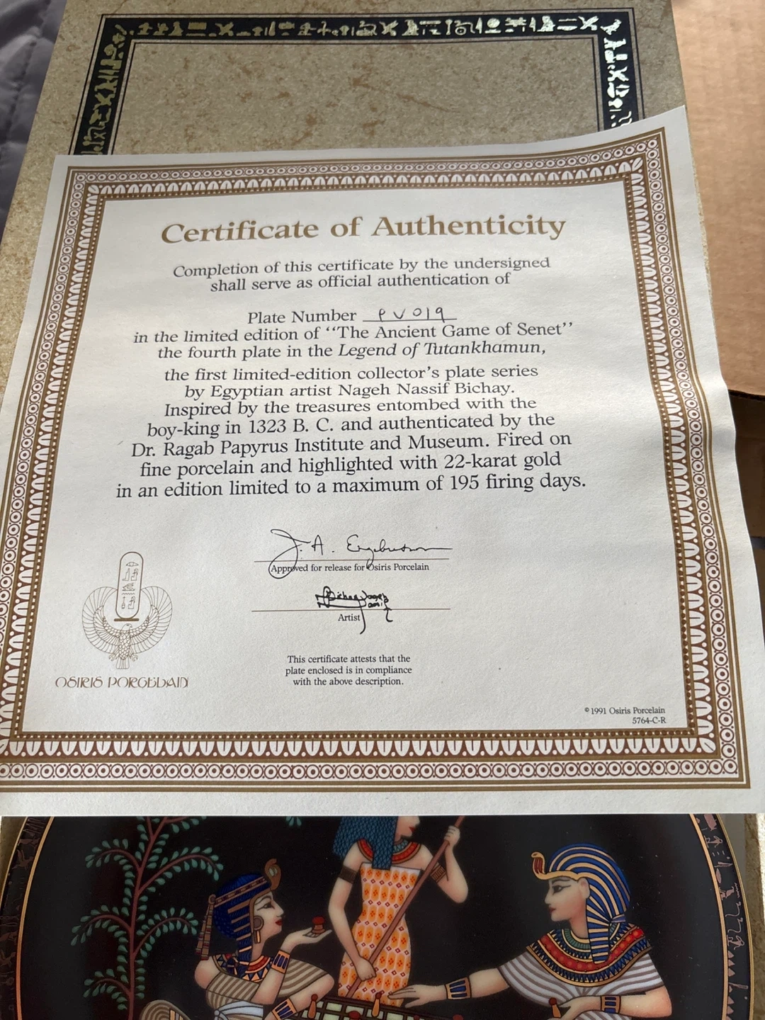 Selling a beautiful Osiris Porcelain collector's plate titled "The Ancient Game of Senet" from the Legend of Tutankhamun series! This limited-edition plate was created by Egyptian artist Nageh Nassif Bichay and inspired by treasures from 1323 B.C. It's authenticated by the Dr. Ragah Papyrus Institute and Museum, fired on fine porcelain, and highlighted with 22-karat gold. It's in excellent condition and comes with its certificate of authenticity and original box
