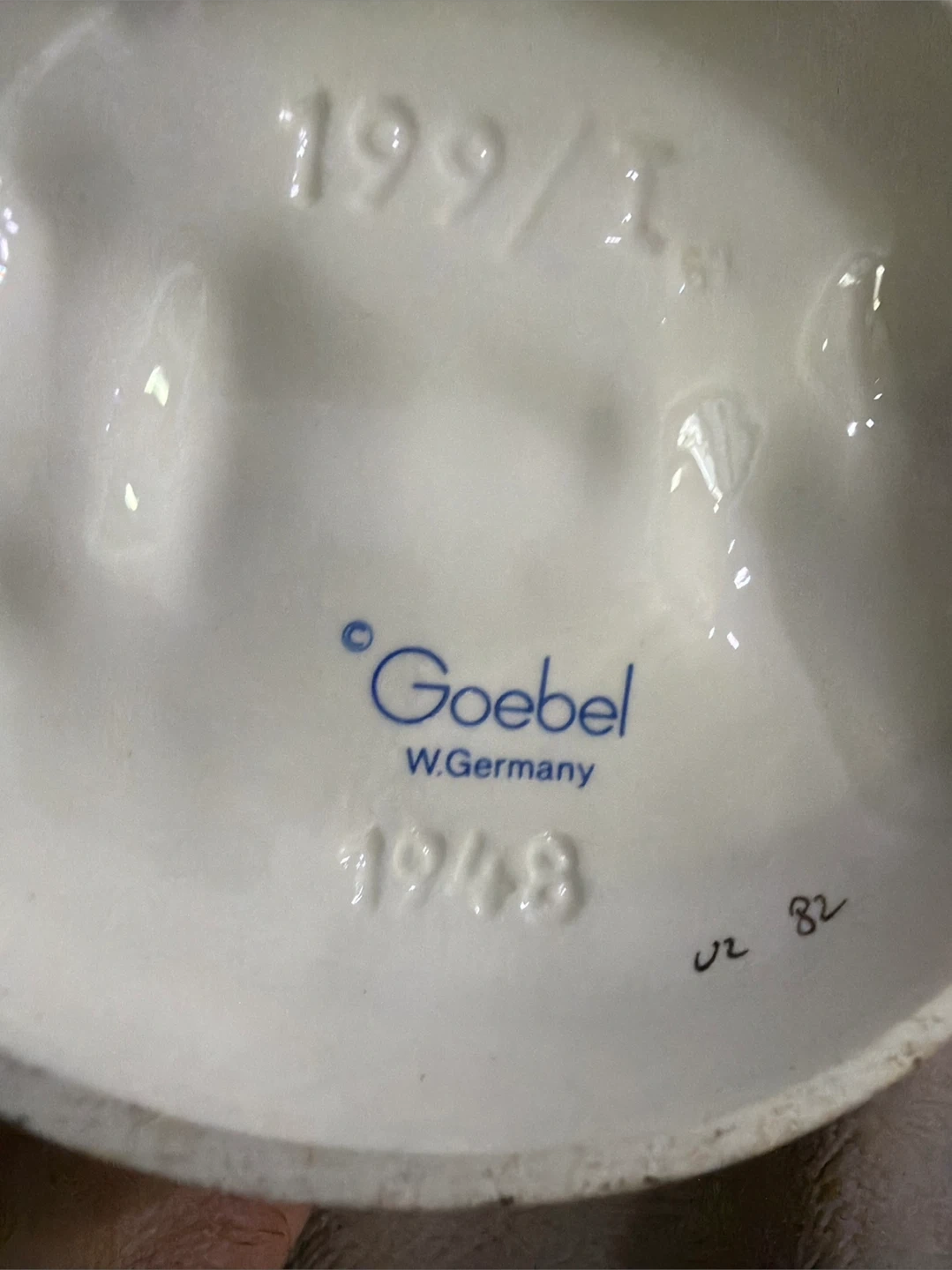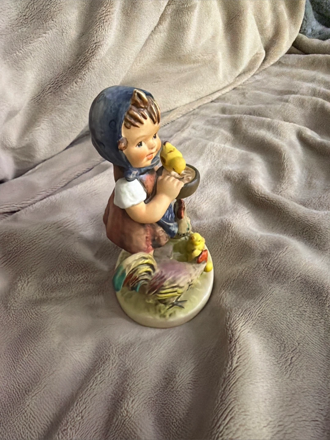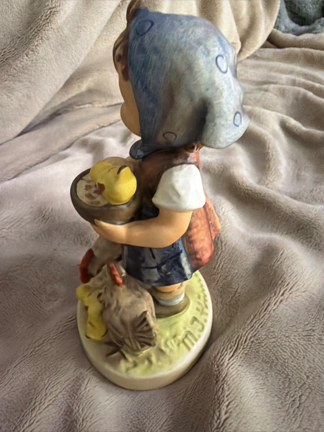 Selling a charming Goebel Hummel figurine featuring a girl feeding chicks, surrounded by chickens. It's marked with 'Goebel W. Germany' and the number 199/I. A lovely addition to any collection!