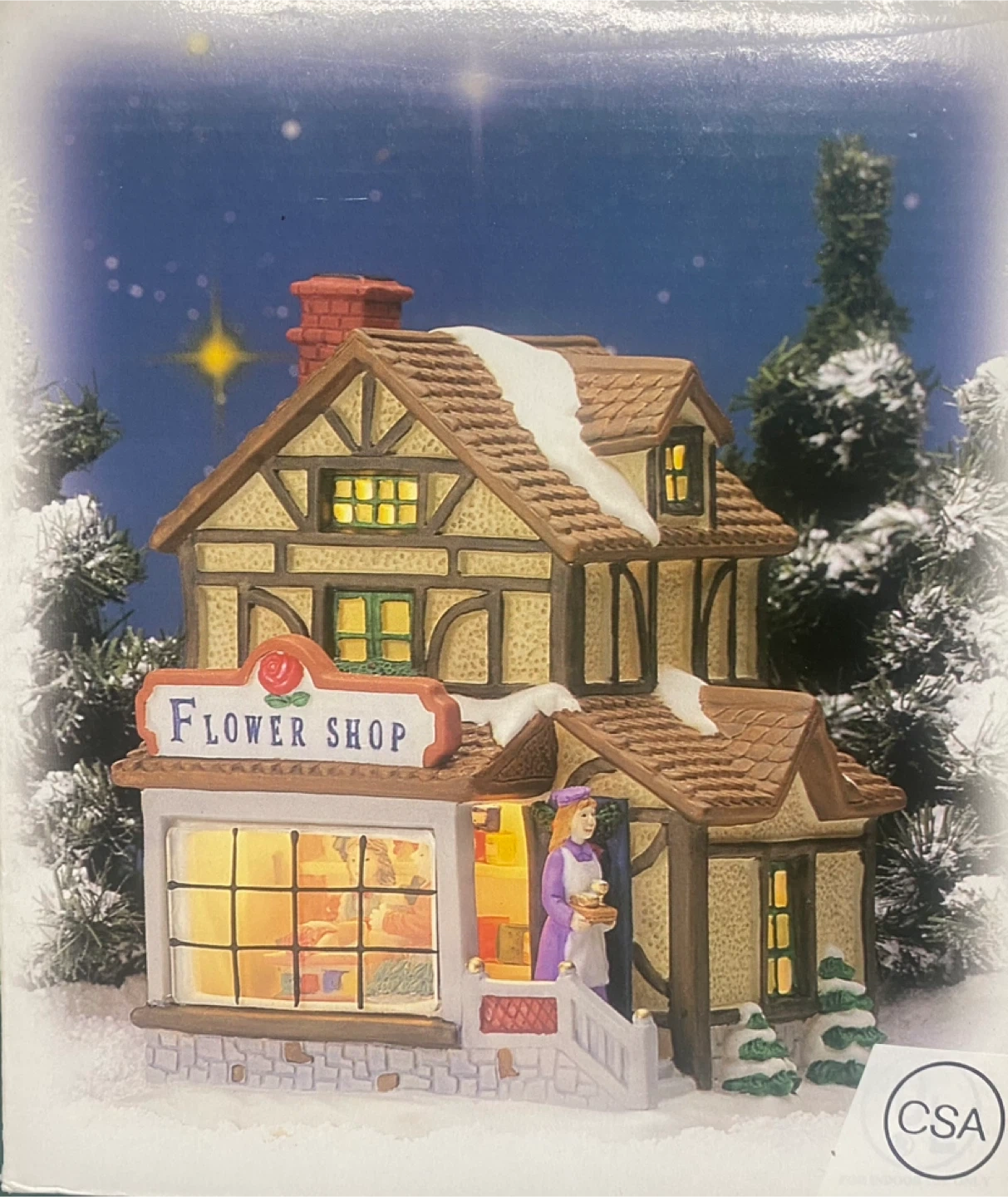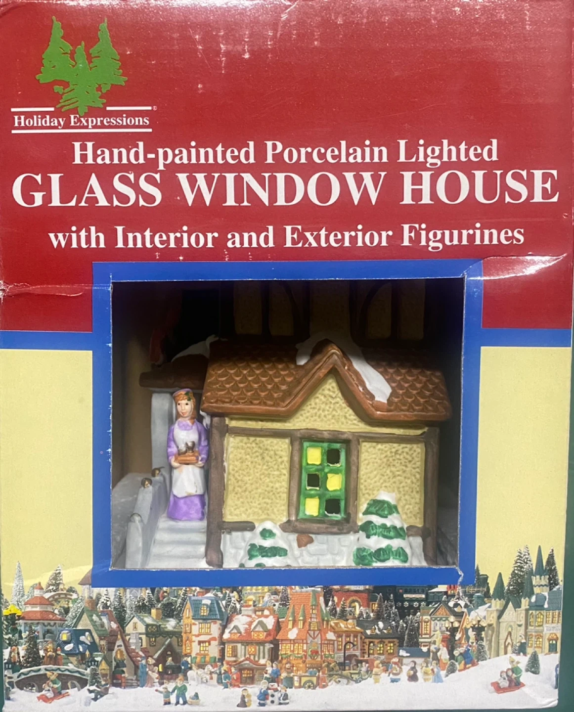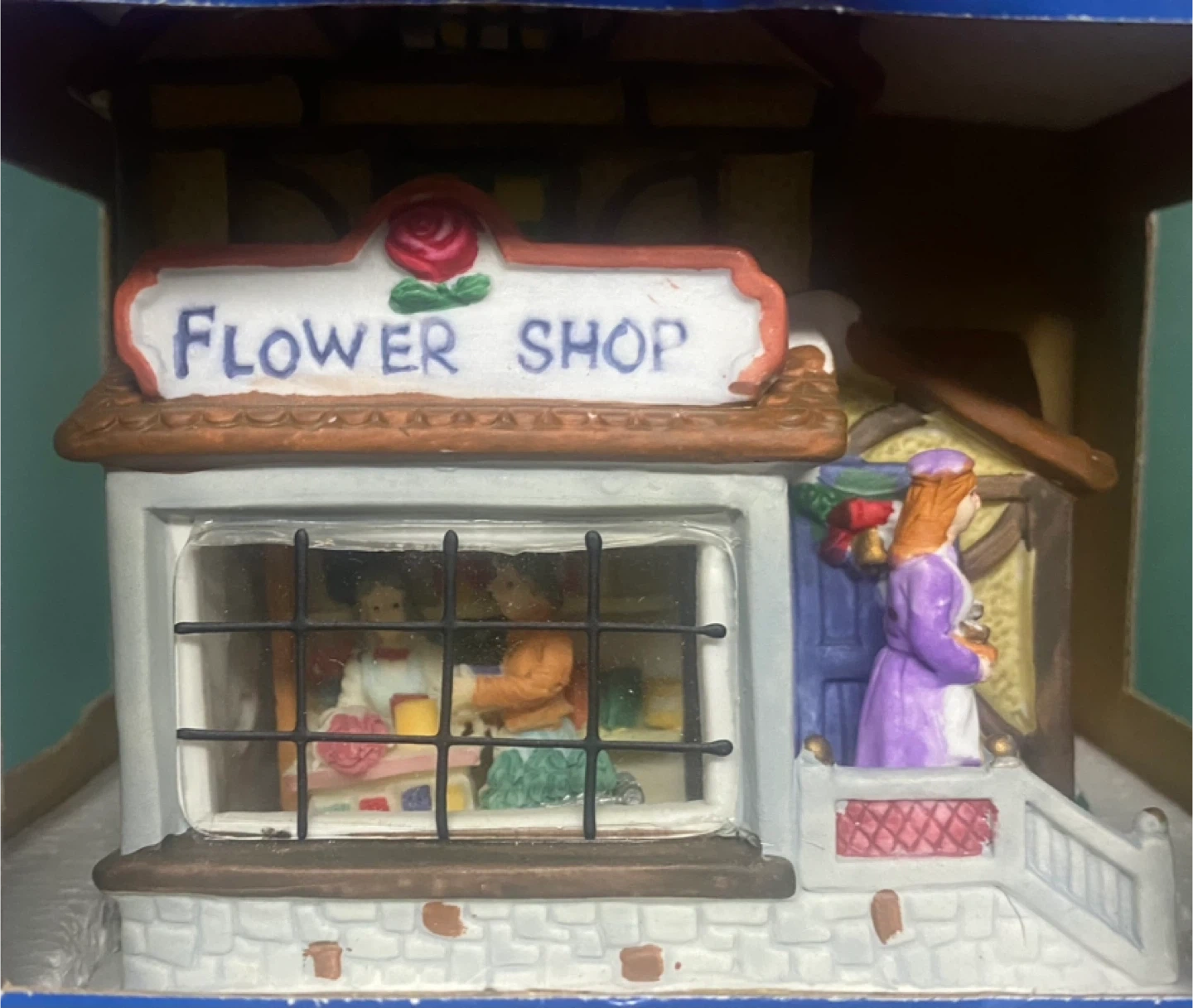 Selling a Holiday Expressions hand-painted porcelain lighted glass window flower shop with interior and exterior figurines! It comes with a 6-foot power cord with bulb. This charming piece will add a cozy touch to your holiday decor