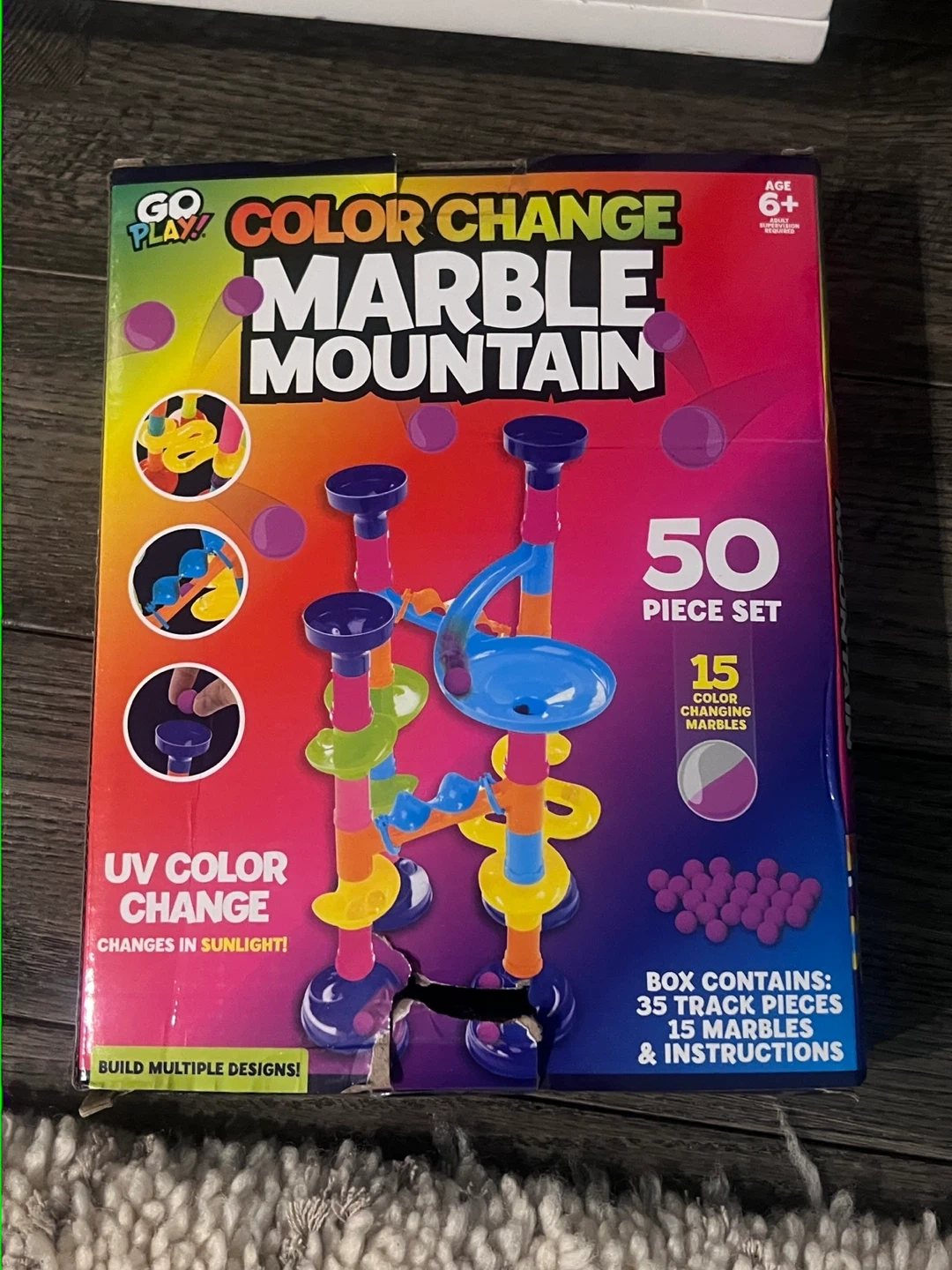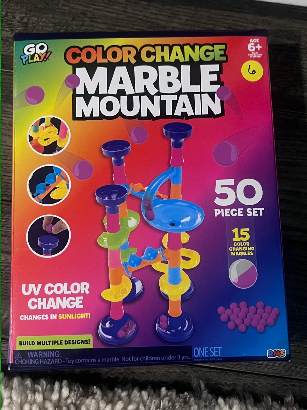 Selling a Go Play! Color Change Marble Mountain set. It includes 50 pieces with 15 color changing marbles. The set also contains 35 track pieces and instructions. It's a fun toy that changes color in sunlight and allows you to build multiple designs! New, unopened, still in box!