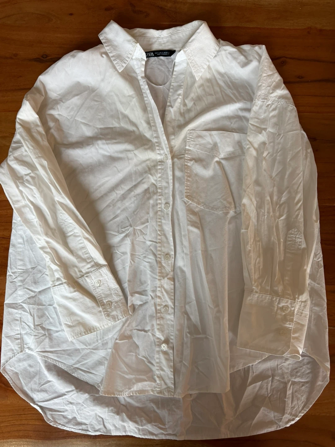 Selling a Zara white button-up shirt! It's in great condition and perfect for a casual or dressed-up look. A classic and versatile piece for any wardrobe!