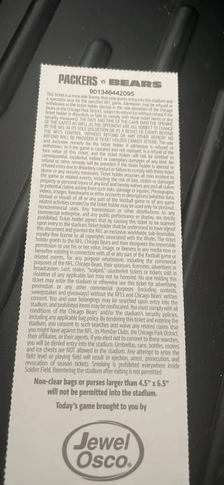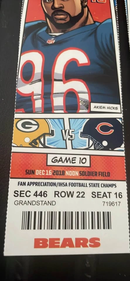 I have two Chicago Bears versus the Green Bay Packers tickets from December 16, 2018. I had season tickets at the time and sold a lot of them since it’s such a pain to get in and out of soldier Field. They literally have been sitting envelope for seven years.