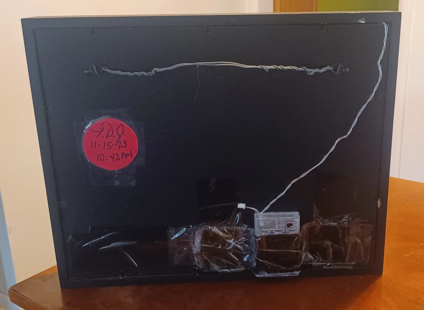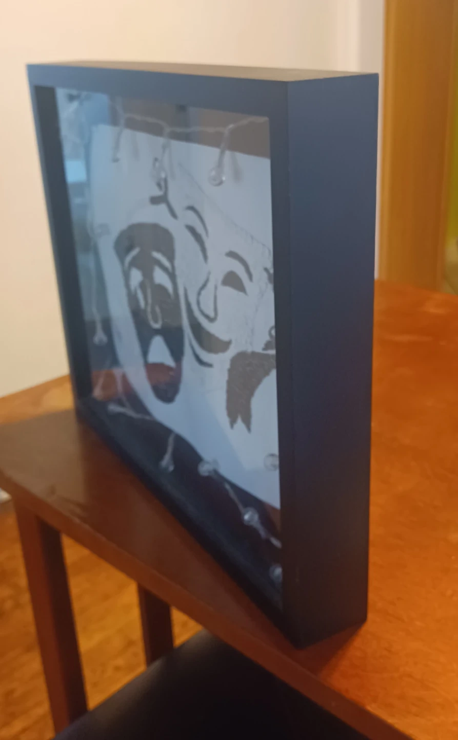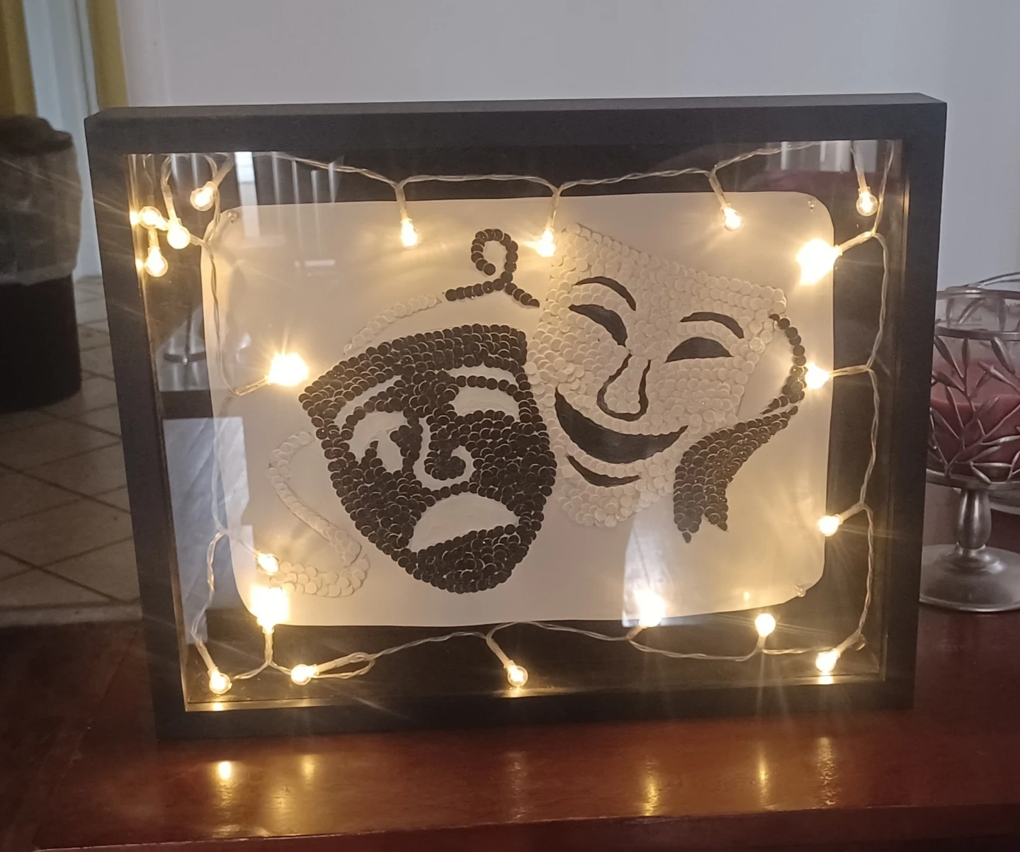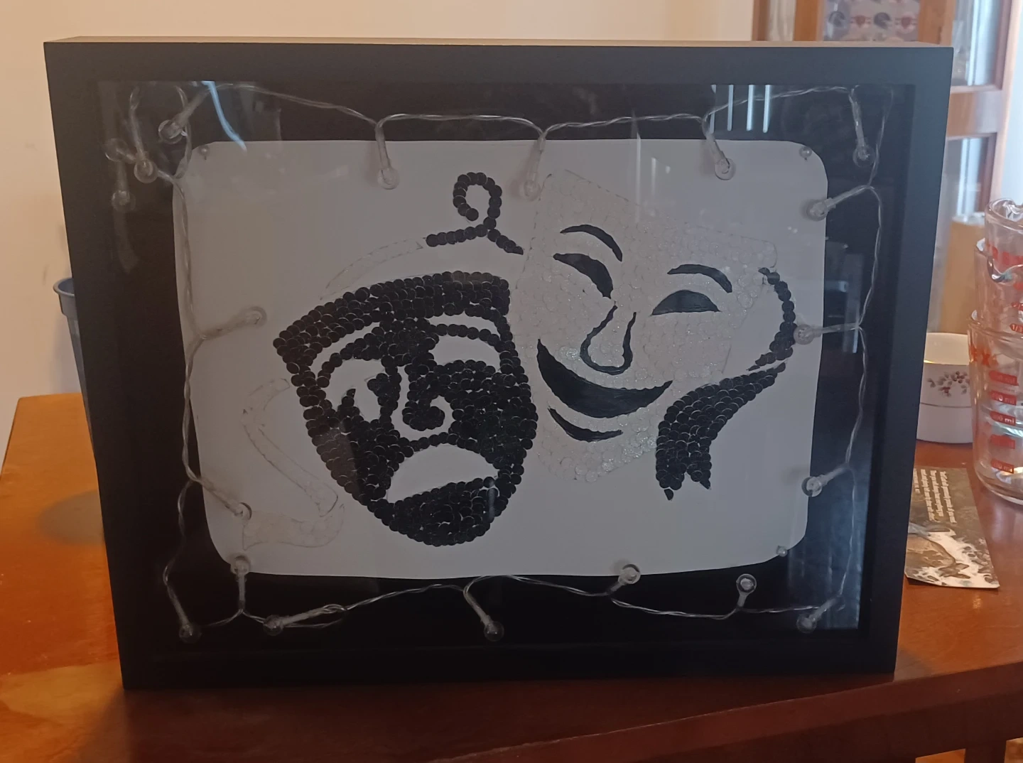 I'm selling a framed piece of art featuring theater masks with decorative lights. It's a unique and eye-catching piece that would look great in any room. The frame is black, and the masks are made of small, dark and light colored materials. The lights add a warm and inviting glow to the artwork 12L X 15W