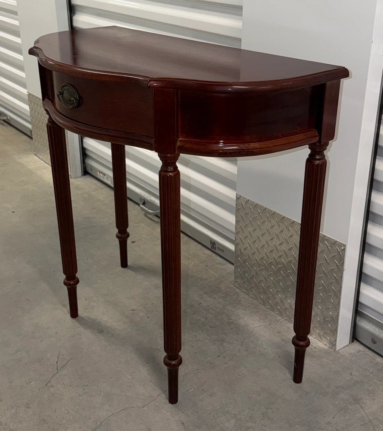 Beautiful mahogany half-moon console table! Solid wood, curved front, antique brass drawer. Perfect for entryway or hallway.