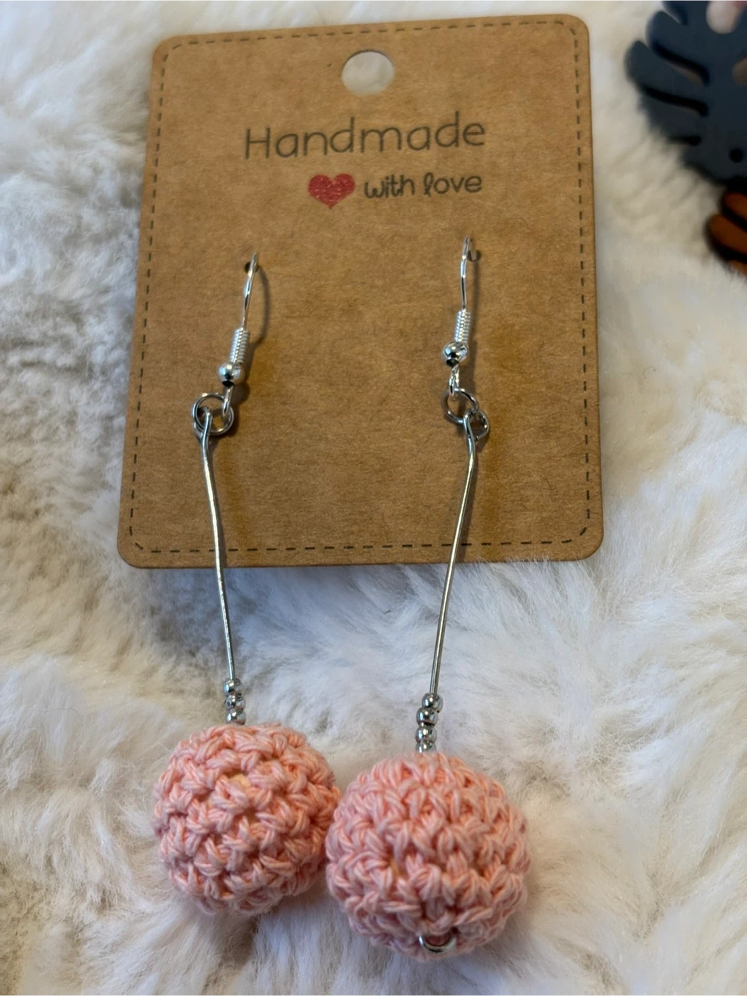 Here are some cute handmade earrings! They feature a crochet ball and a silver-tone drop. Perfect for adding a touch of whimsy to any outfit.
