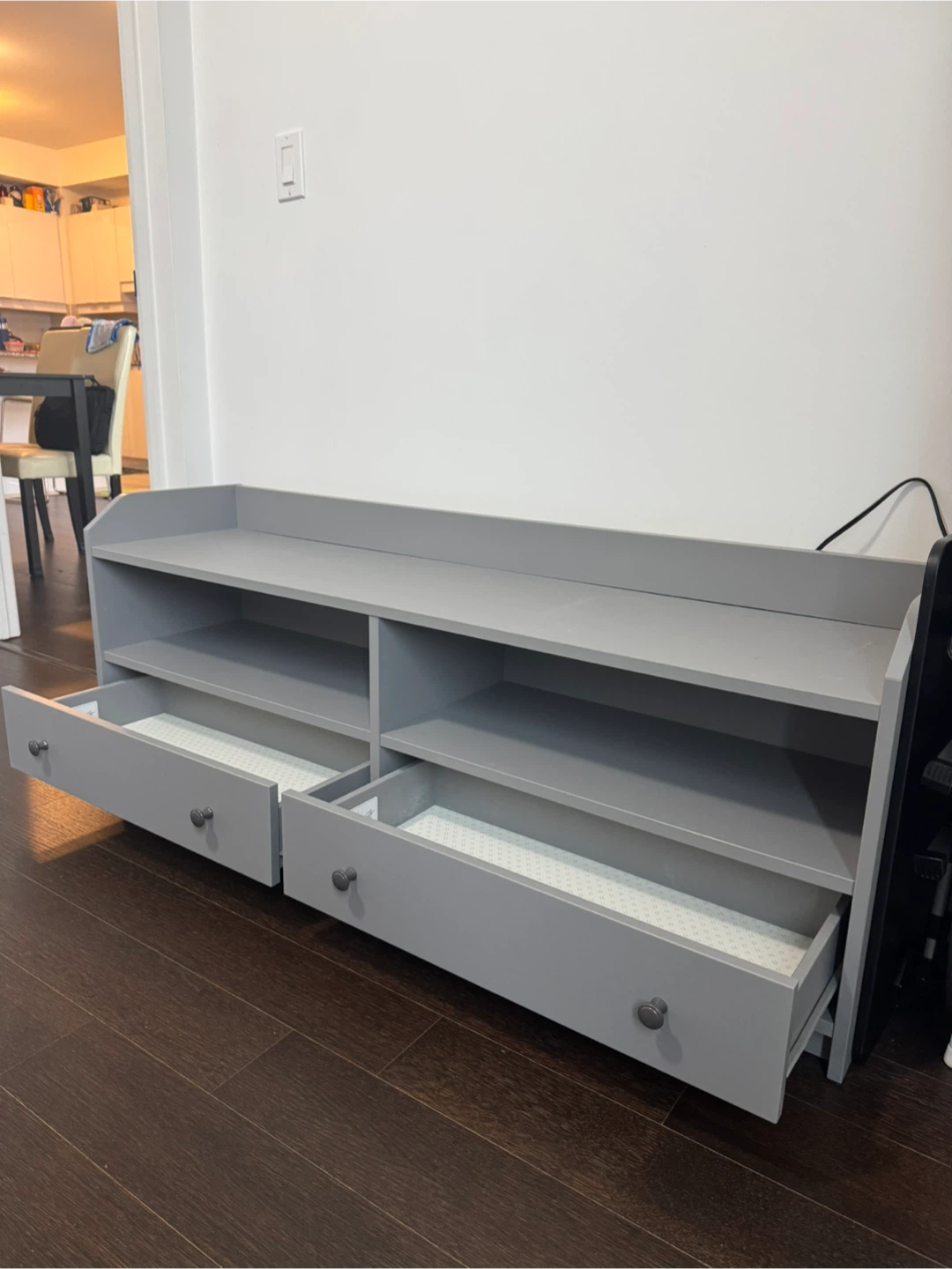 Selling my HAUGA TV bench, kept in excellent shape with no damage. It has two smooth drawers, an open shelf for devices, and a back opening for easy cable management. Fits TVs up to around 50 inches and offers clean, simple storage without taking much space.