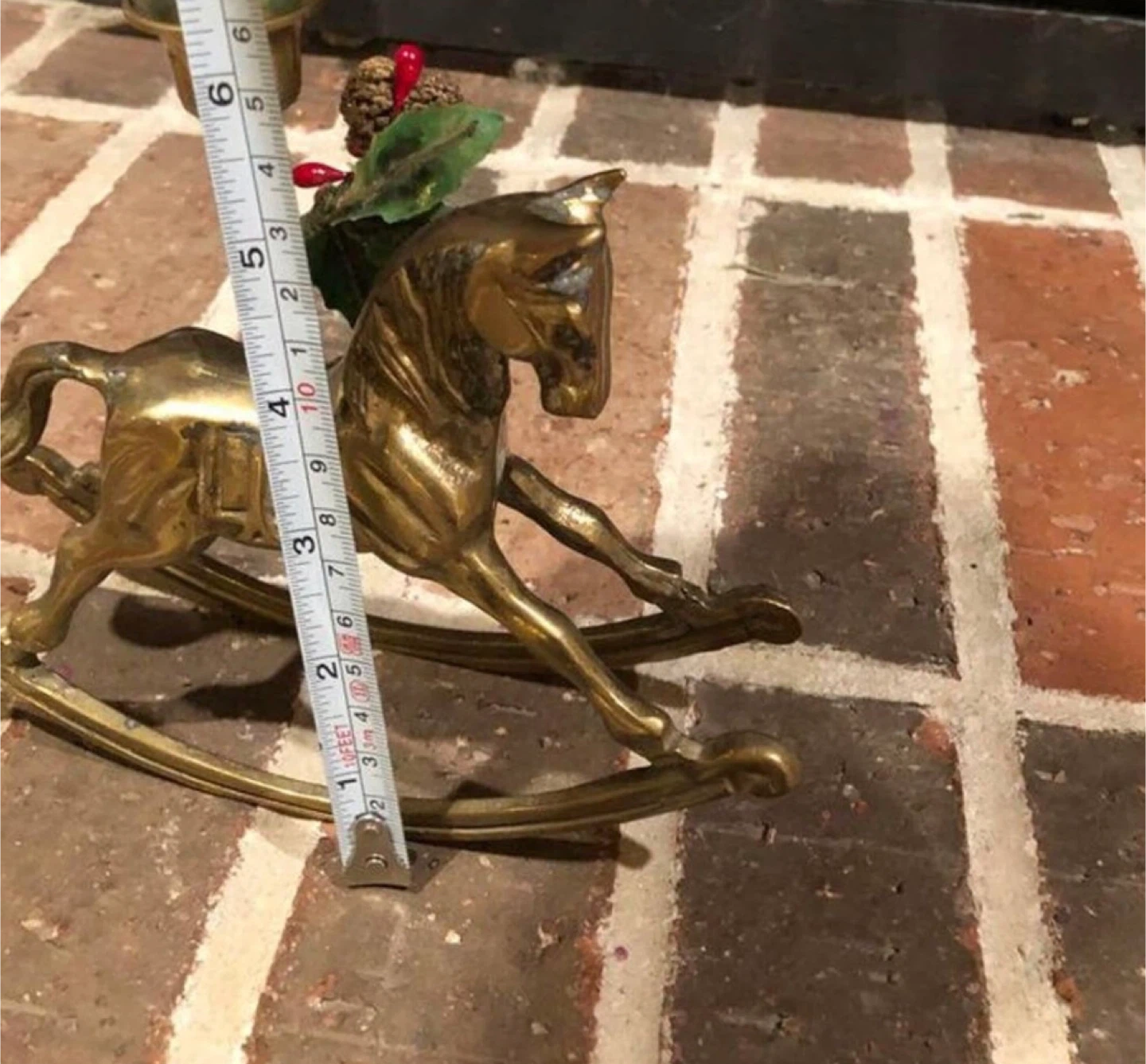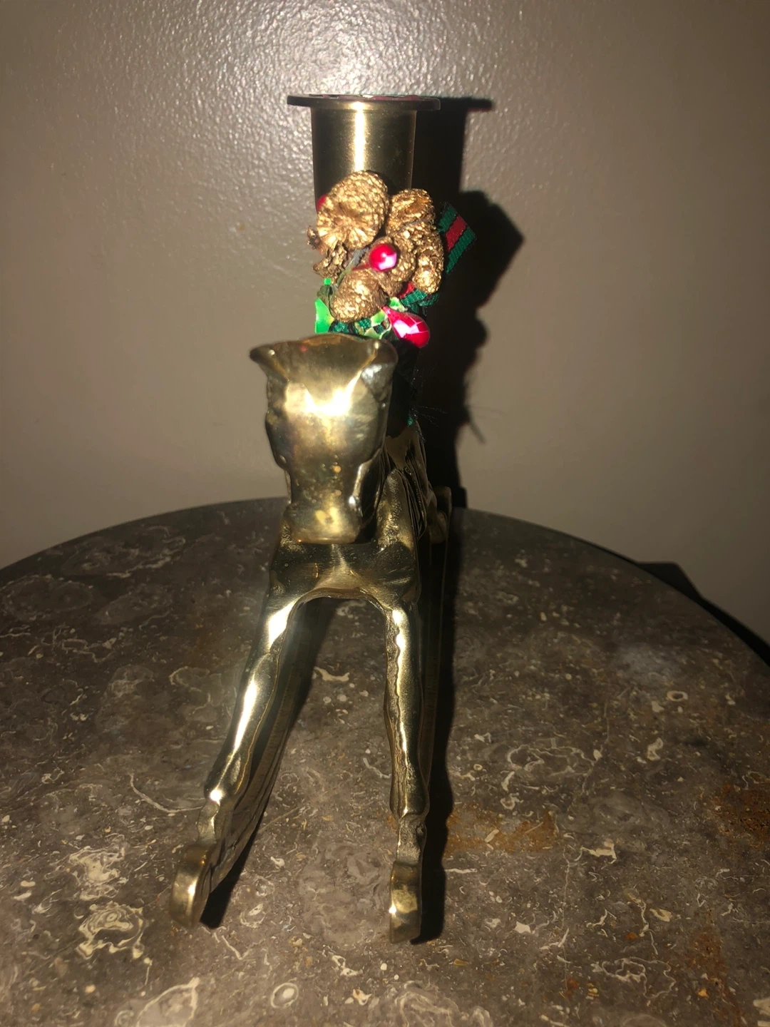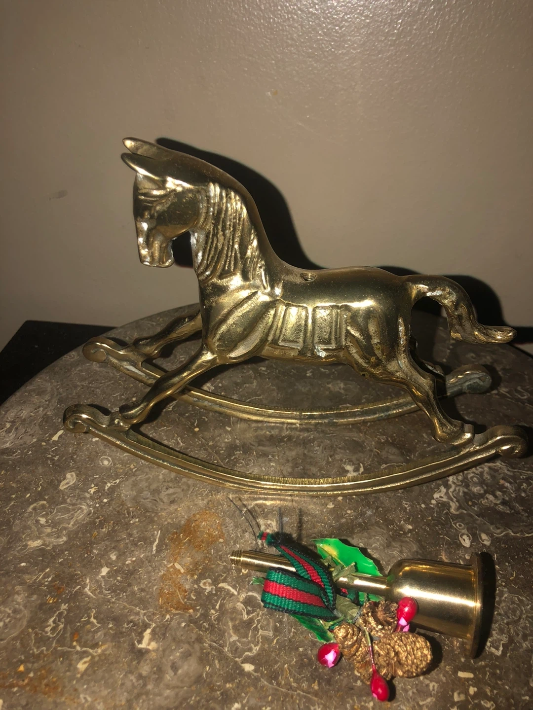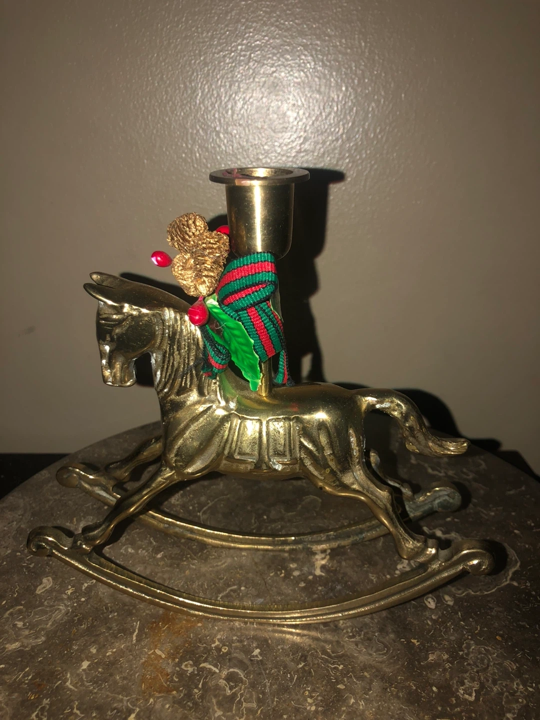 Selling a vintage gold brass rocking horse candlestick holder. It's a unique piece that adds a touch of charm to any room. The candlestick holder is in good condition and ready to be displayed in your home!