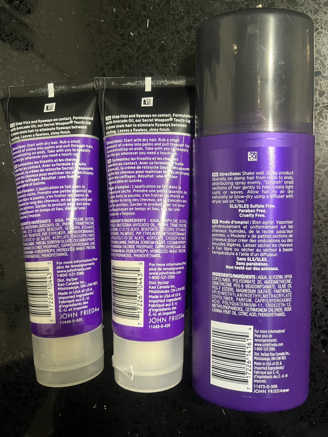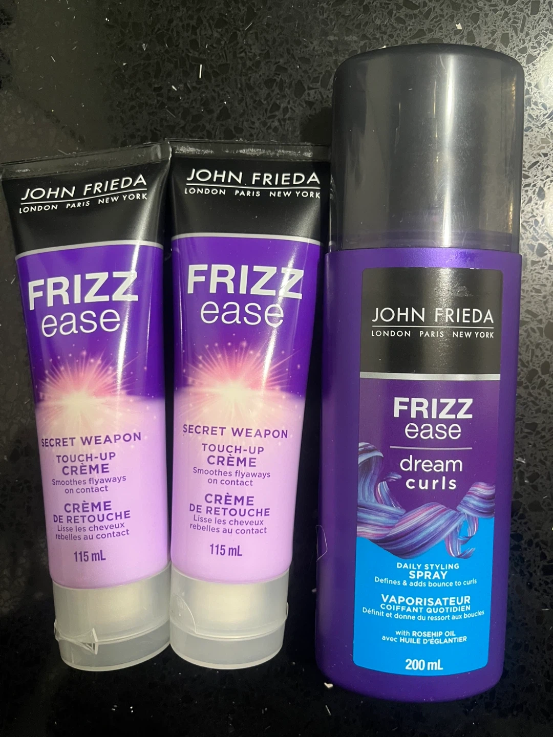 Selling a set of John Frieda Frizz Ease hair products! Included are two Secret Weapon Touch-Up Creams (115 ml each) and one Dream Curls Daily Styling Spray (200 ml).Cash only