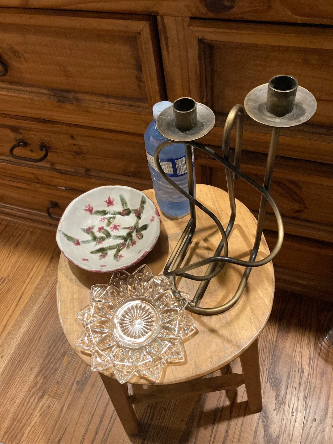 Selling a charming set of home decor items. Take everything for $4! Included is a ceramic bowl with a floral design, a starburst-patterned glass dish, and a very unique metal candle holder that can hold two candles. Perfect for adding a touch of style to your home decor. Water bottle in photo to show size of items.