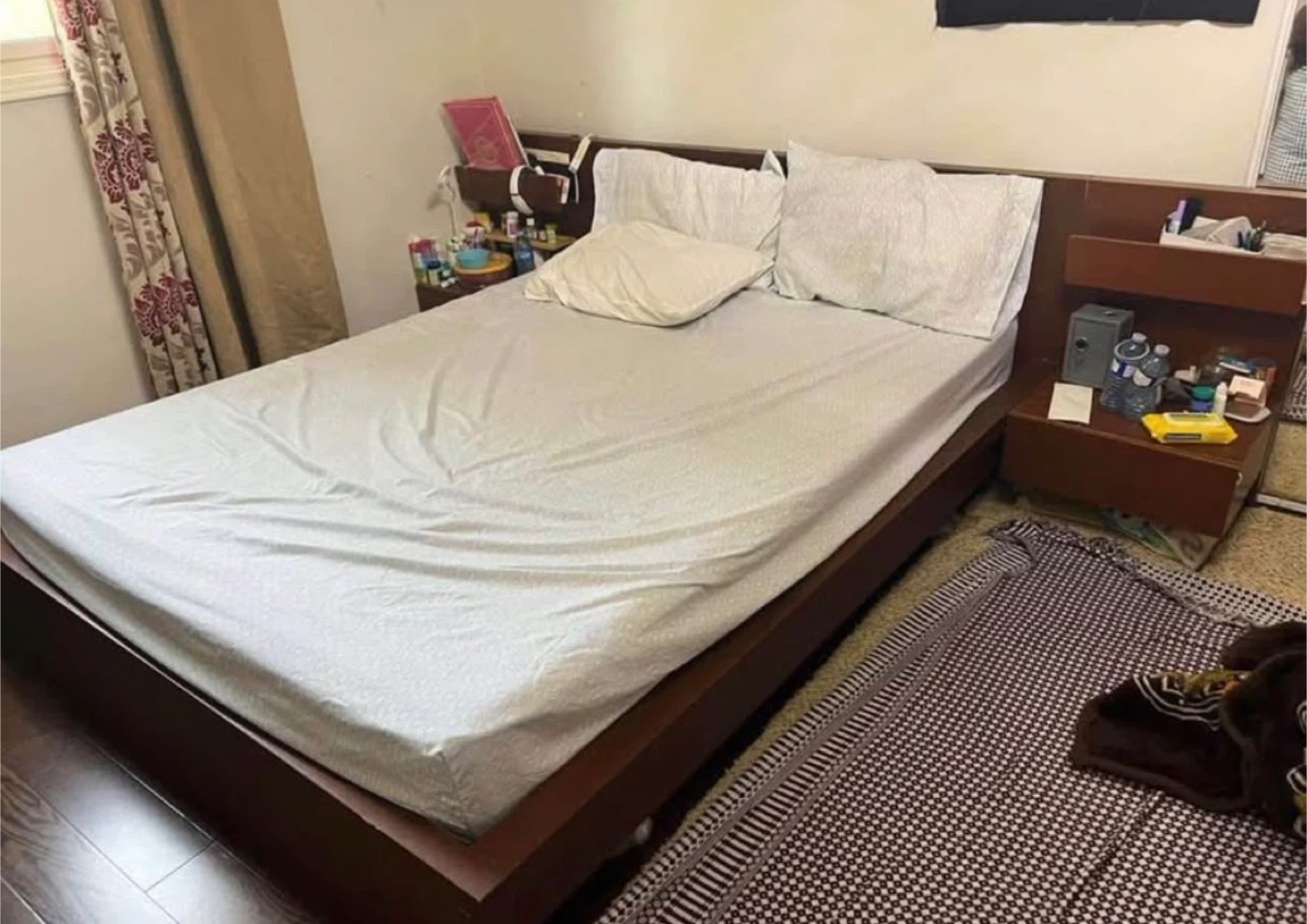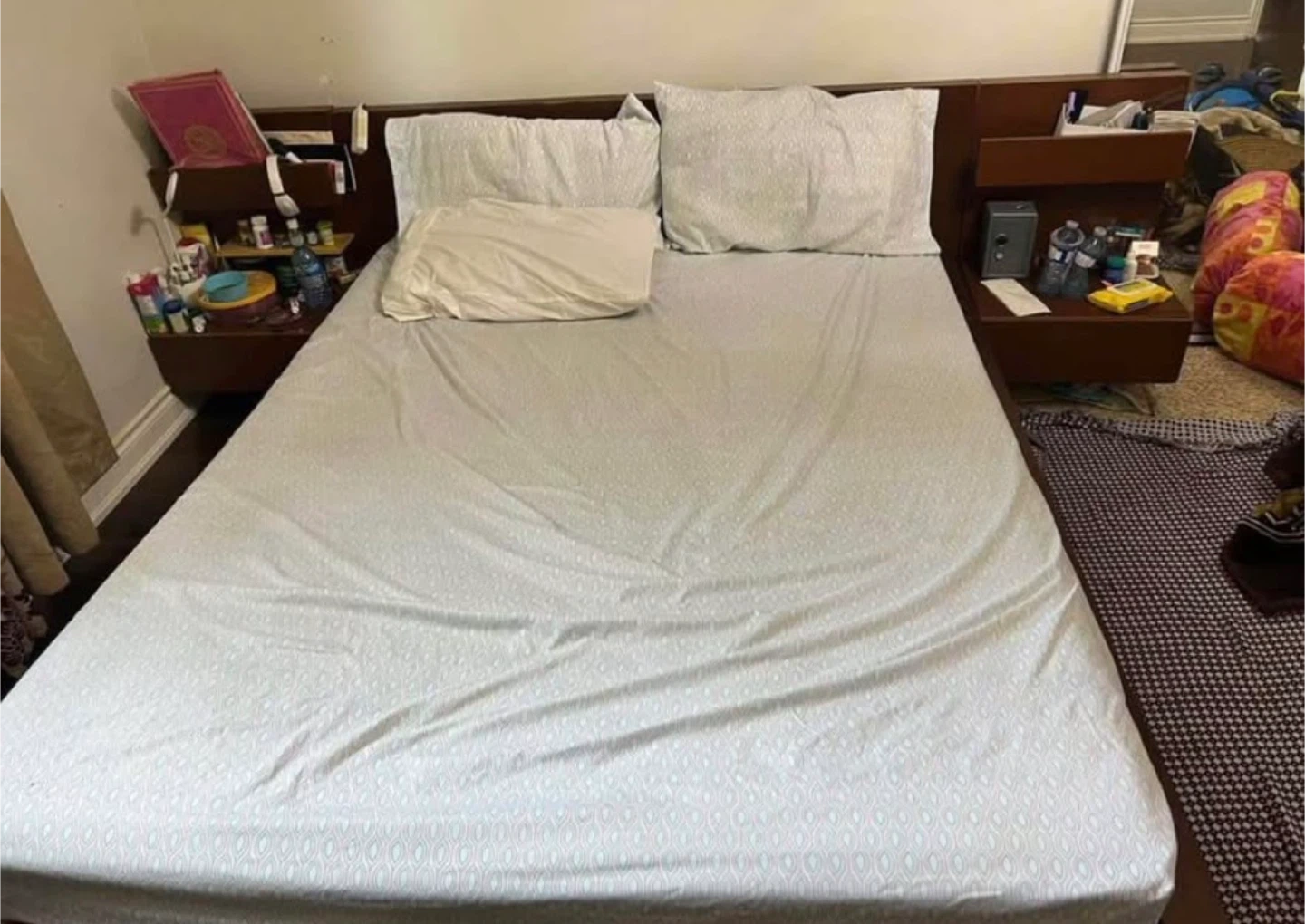 Selling a queen size bed frame that comes with attached nightstands. It's a great space saver and adds a unique touch to any bedroom. The frame is sturdy and in good condition, ready for a new home!