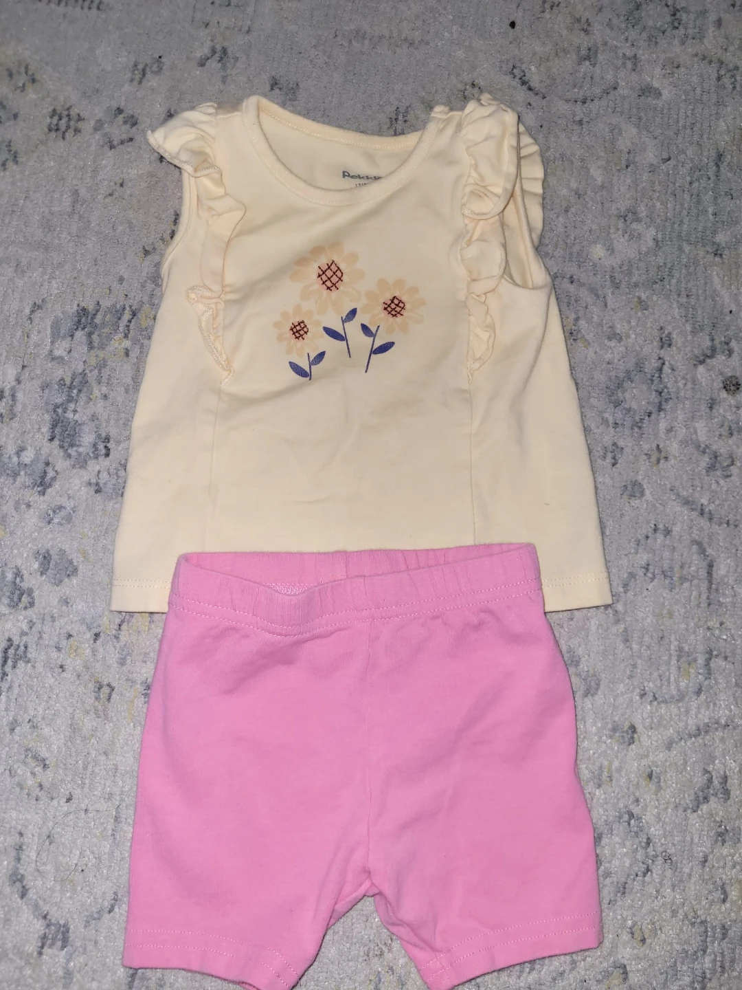 Selling a cute bundle of baby clothes! Includes a Carter's romper, a long-sleeved floral top, and a two-piece set with a yellow top and pink shorts. All in great condition and ready for a new home. Only available for pickup