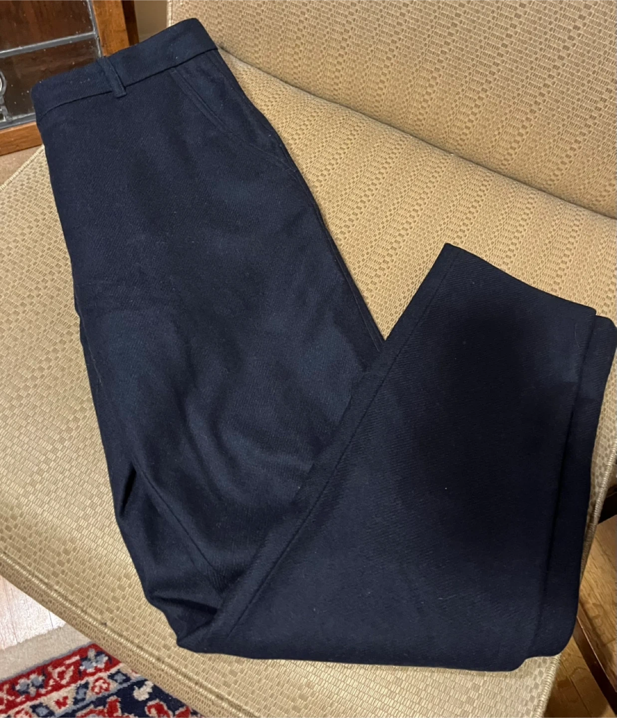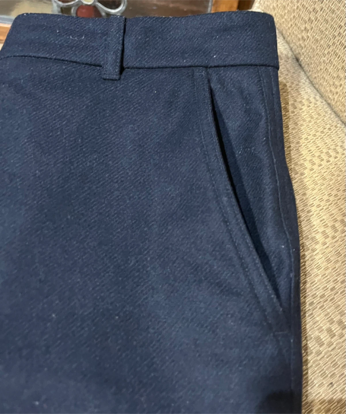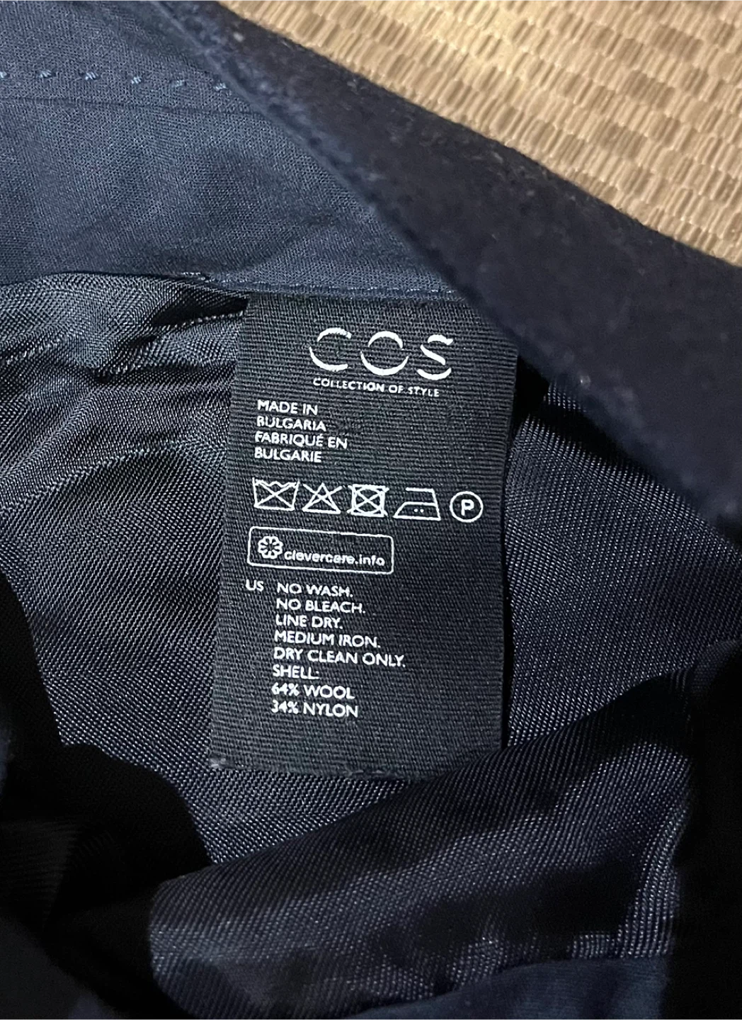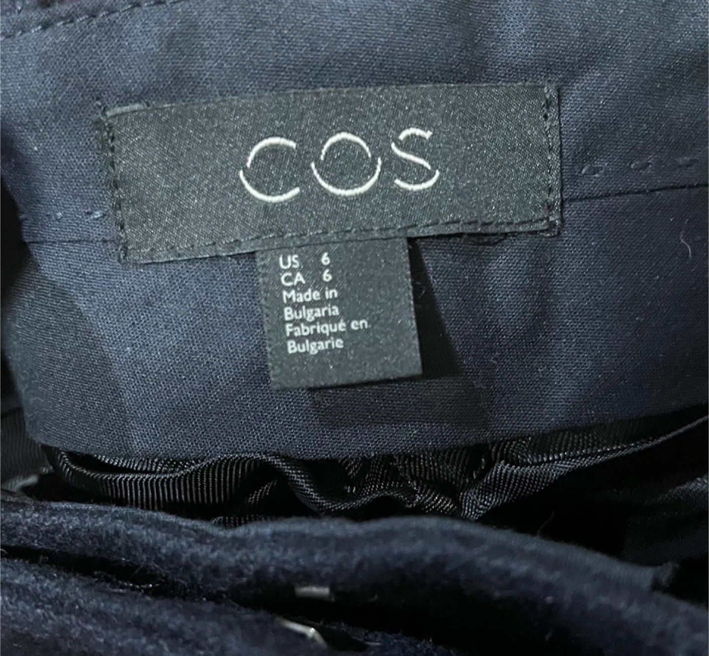 Selling a pair of COS pants in size 6, but they fit smaller. They're a lovely dark blue colour and made from 64% wool and 34% nylon. The pants are in great condition and ready for a new home!