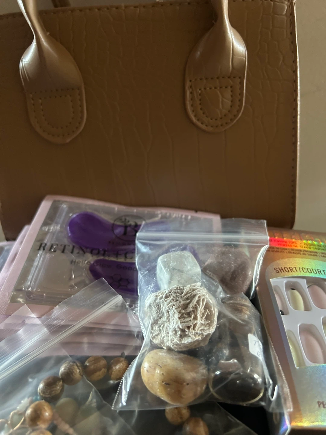 Selling a variety of items together! Included is a cute beige handbag with a textured design, retinol eye masks for skincare, a set of short press-on nails, and some other small items. Perfect for someone looking to try new things or stock up on essentials!