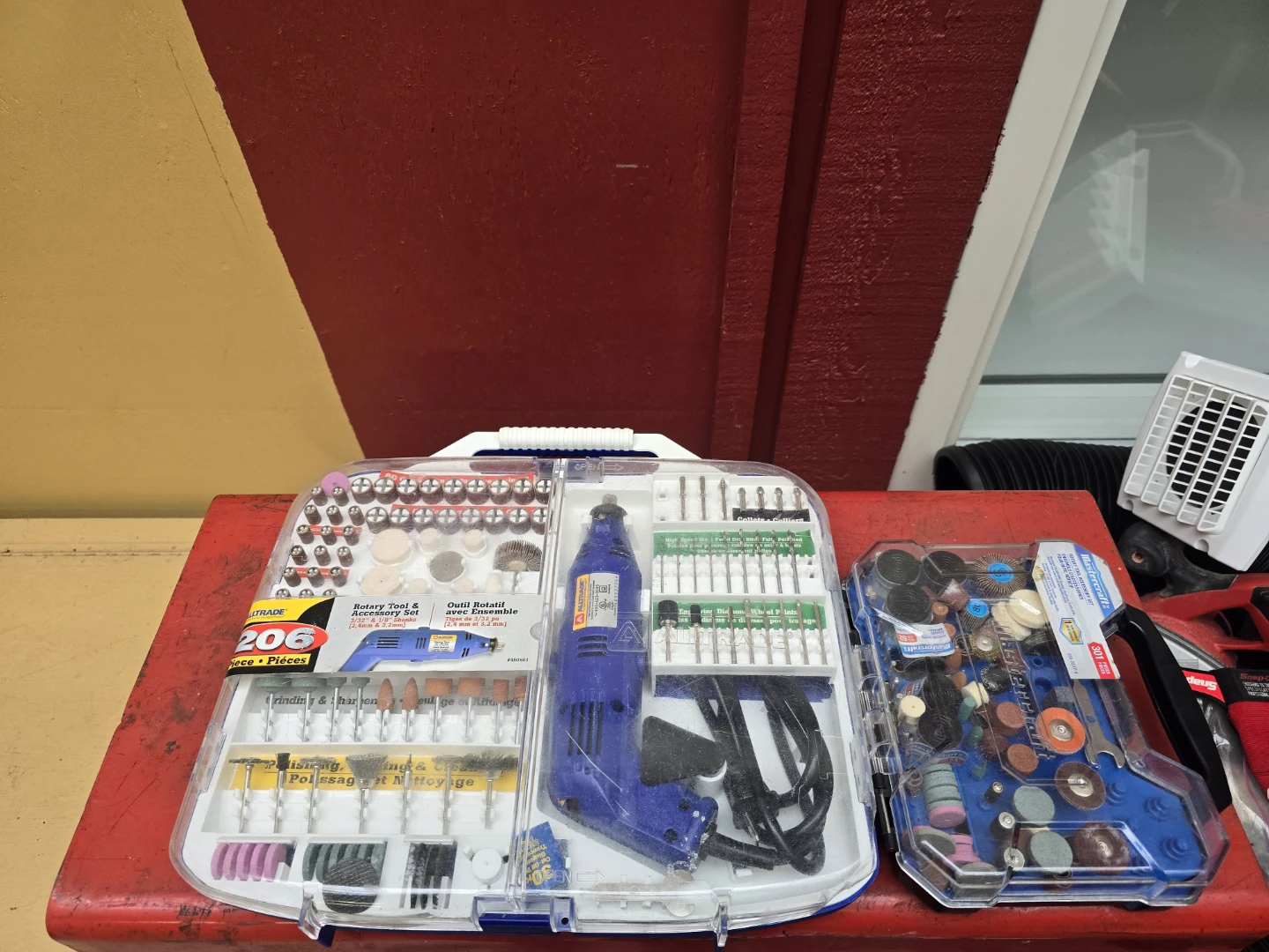 Selling an Alltrade rotary tool and accessory set, complete with 206 pieces! Perfect for grinding, sharpening, polishing and cleaning. Includes a variety of bits and attachments for different tasks