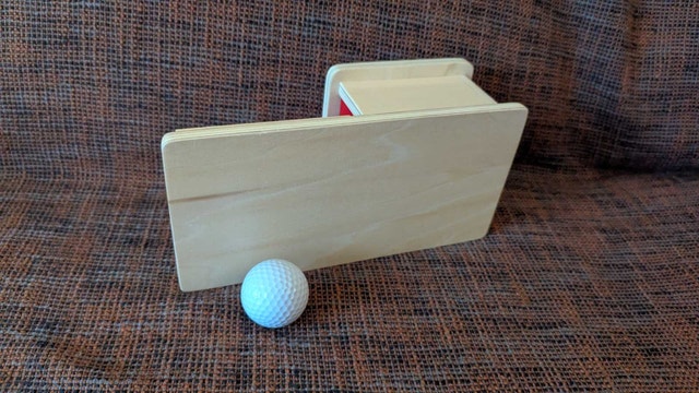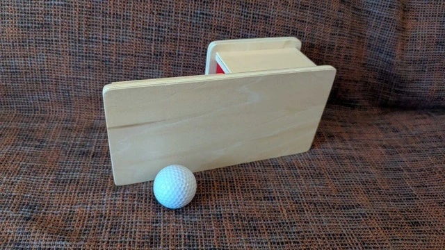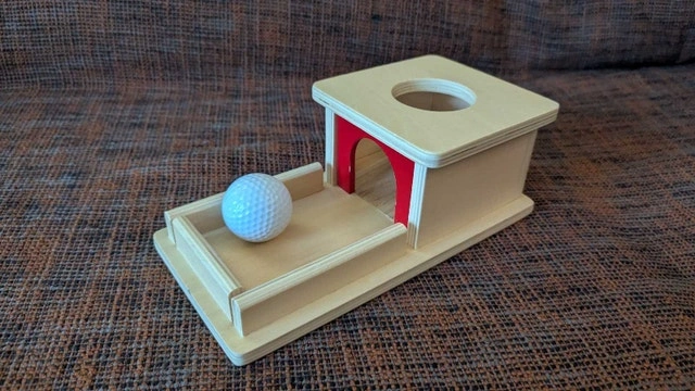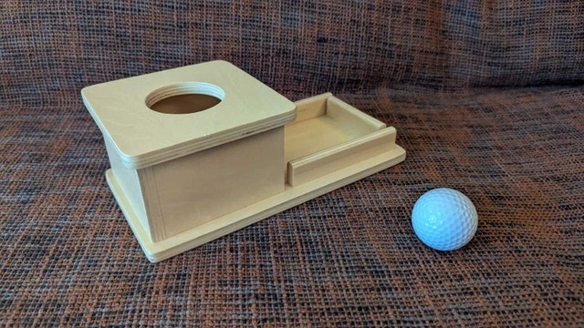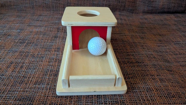 This is a Montessori Object permanence box. A ball is placed into a hole on the top of the box and then rolls out.