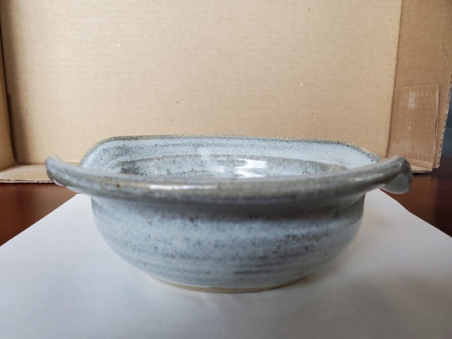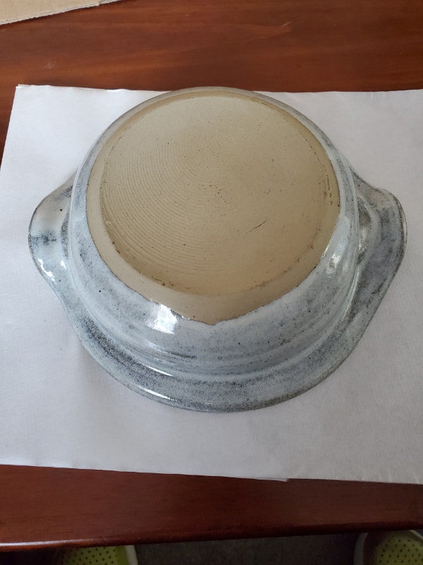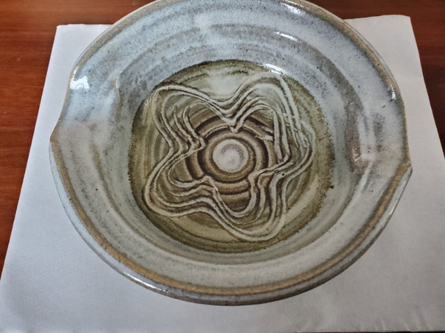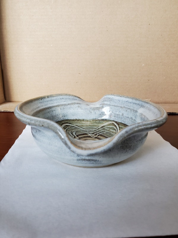Nice, handmade little pottery bowl with spouts. It has a lovely glaze and pattern in the centre. Measures 6.25" in diameter, 6.5" from spout to spout, and about 2" deep. $5.00, pick up only.