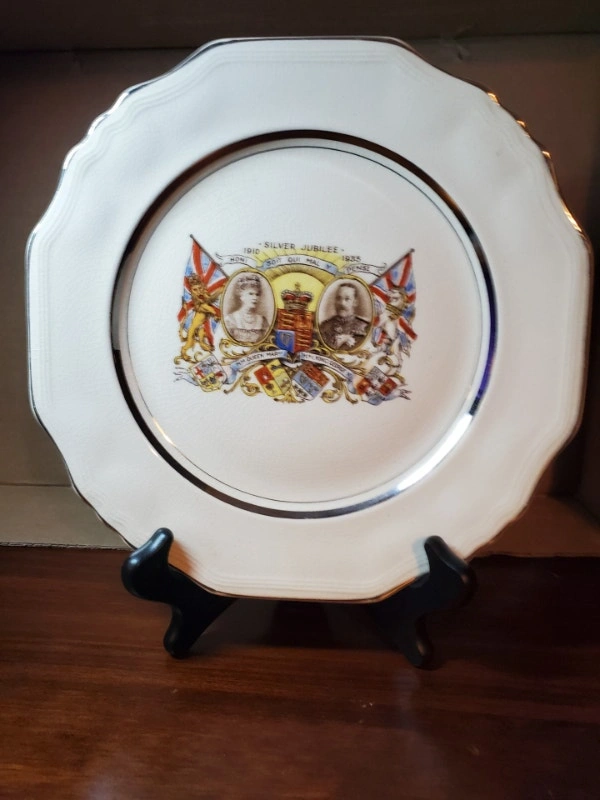 A vintage plate commemorating George V's silver jubilee in 1935. The plate features King George V and Queen Mary. Made in 1935 by Sovereign Potters Canada, it's about 9" in diameter. Good condition, but has crazing (no chips or cracks). $10.00, pick up only
