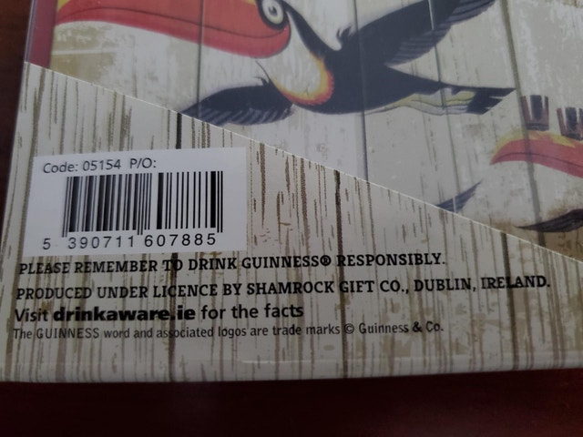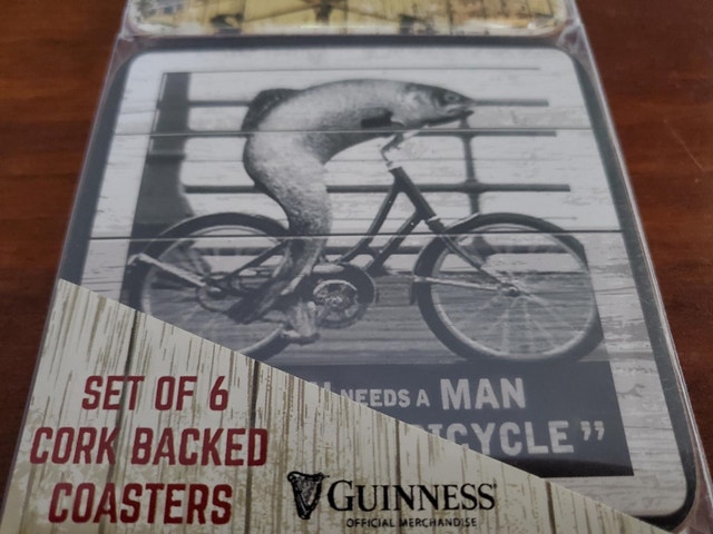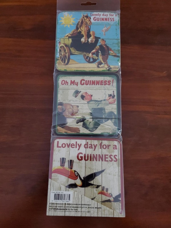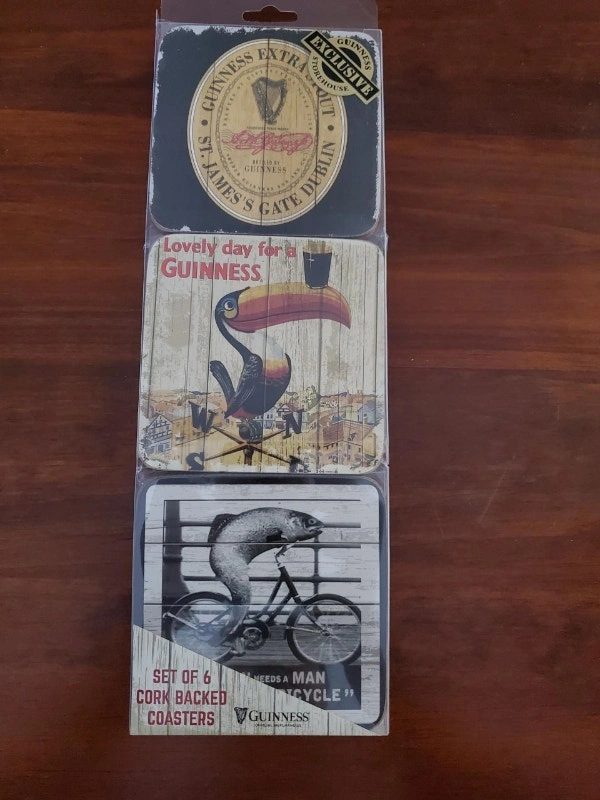 A set of 6 cork backed Guinness coasters with assorted vintage designs in a plastic sleeve. The coasters are new but the packaging is a little banged up. $10.00.